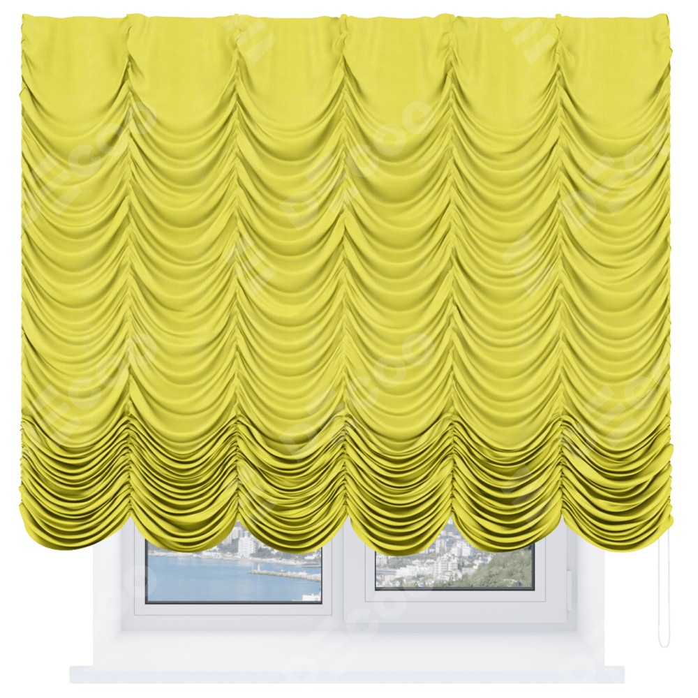 Французская штора производителя «Cortin», используется для проёма, пошита из ткани вельвет светло-желтый, артикул ткани 30997. Имеет универсальный механизм и подходит для монтажа: на потолок и на стену.