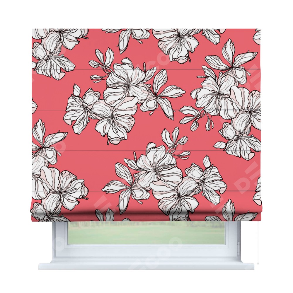 Римская штора производителя «Cortin», используется для проёма, пошита из ткани блэкаут с нанесением сублимационной печати «Белые цветы». Имеет универсальный механизм и подходит для монтажа: на потолок, на стену и в нишу.