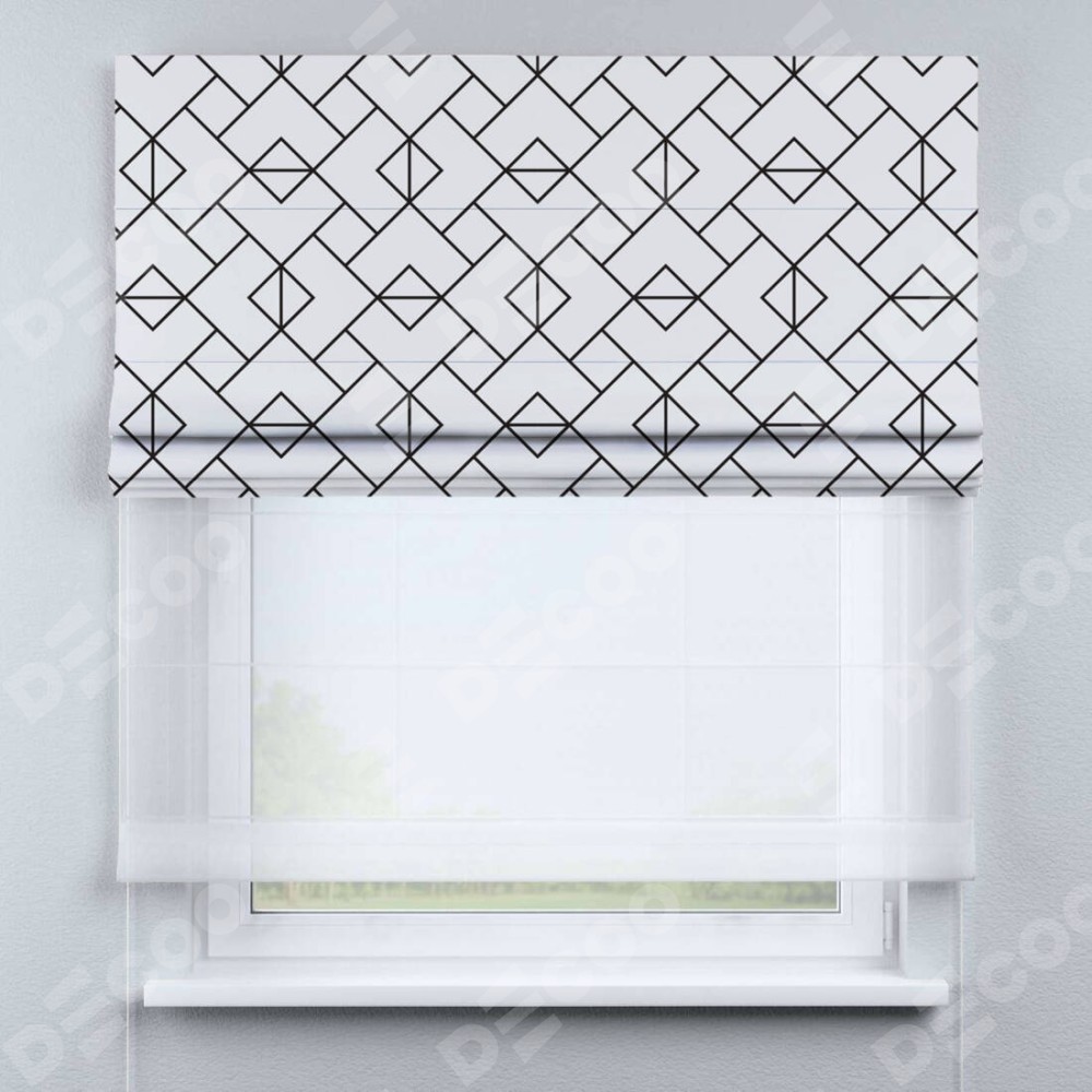 Римская штора день-ночь производителя «Cortin», используется для проёма, пошита из двух полотен, с лицевой блэкаут с нанесением сублимационной печати «Геометрический орнамент», вторая ткань тюль (по стандарту комплектуется тюль белого цвета артикул V-01). Имеет универсальный механизм и подходит для монтажа: на потолок, на стену и в нишу.