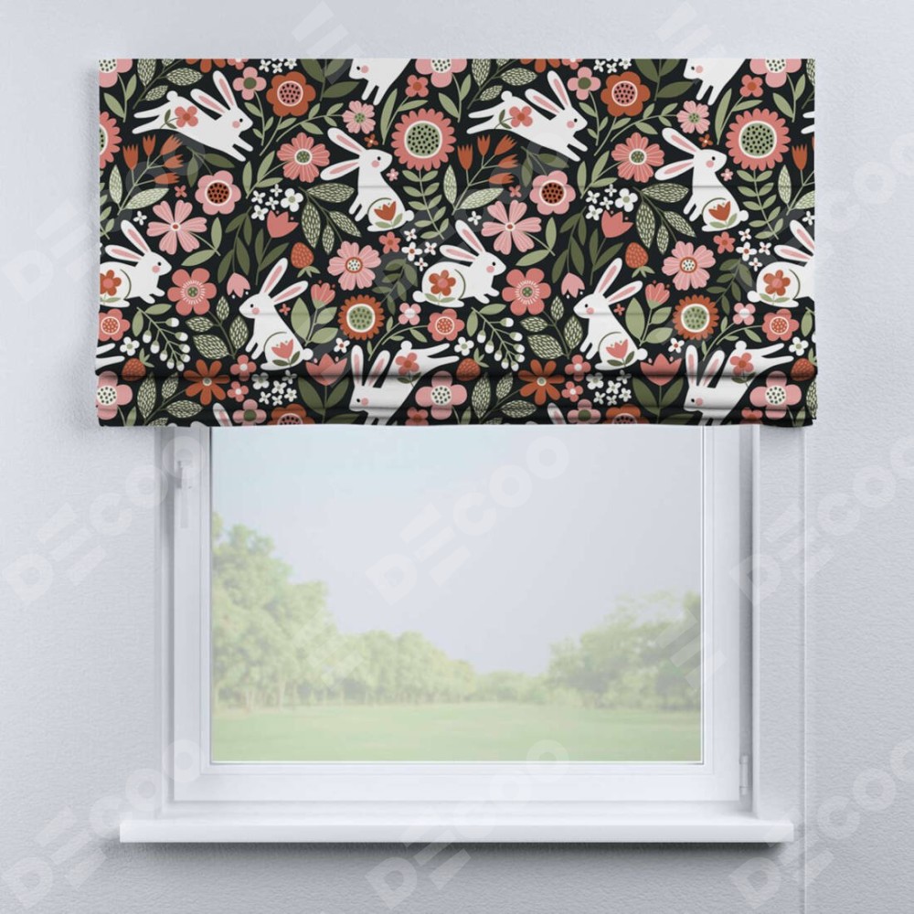 Римская штора производителя «Cortin», используется для проёма, пошита из ткани блэкаут с нанесением сублимационной печати «Зайчики в цветнике». Имеет универсальный механизм и подходит для монтажа: на потолок, на стену и в нишу.