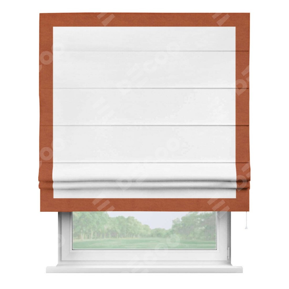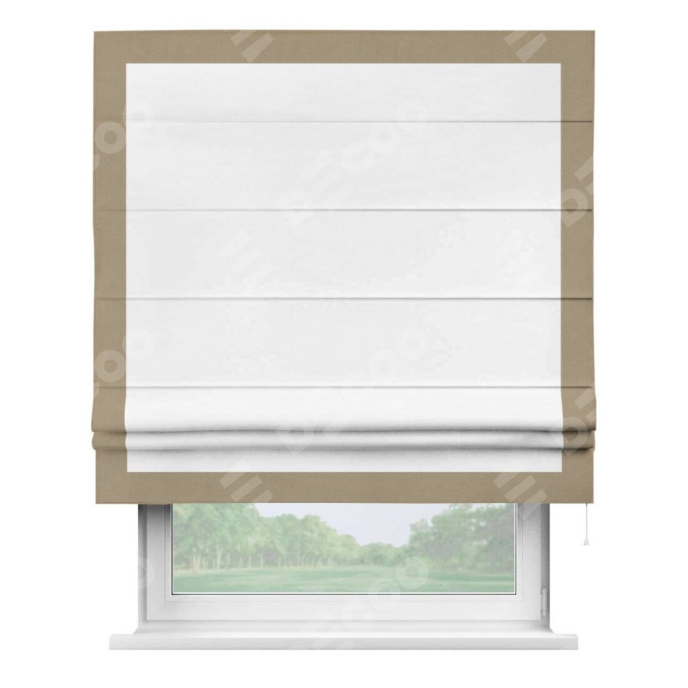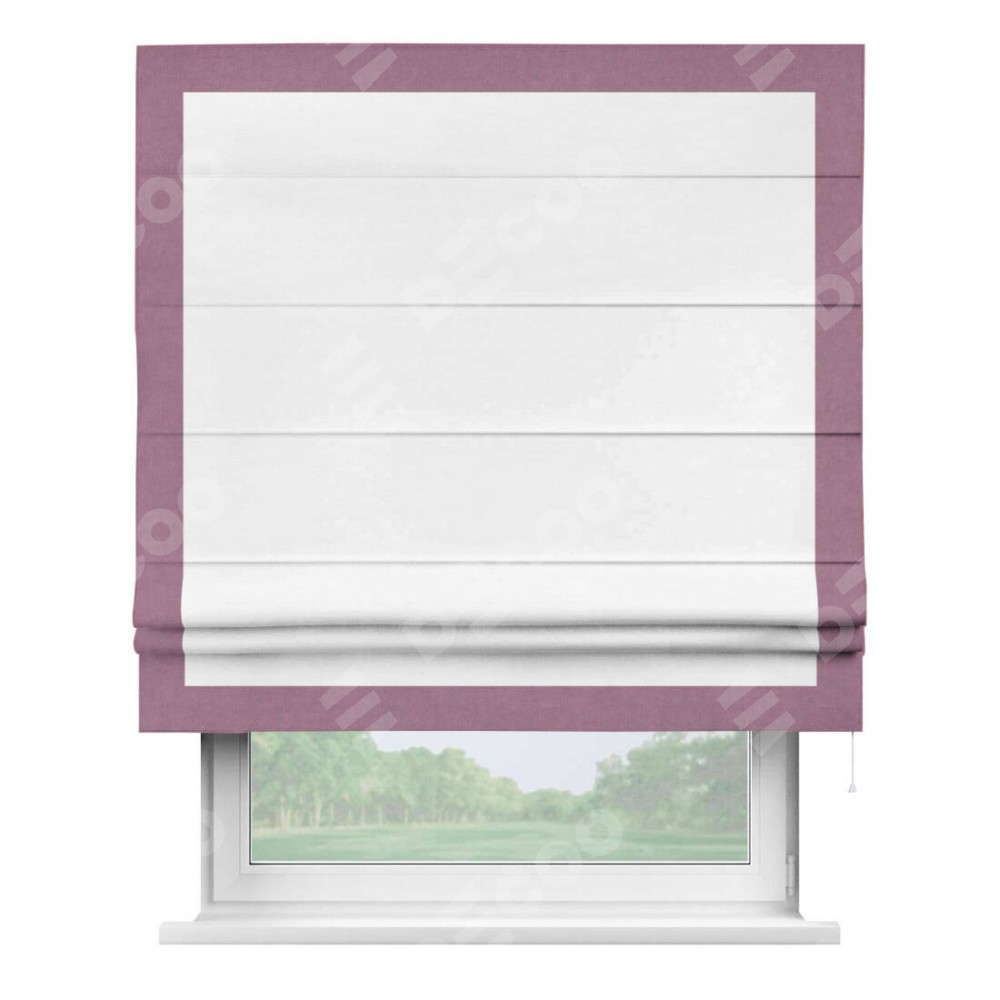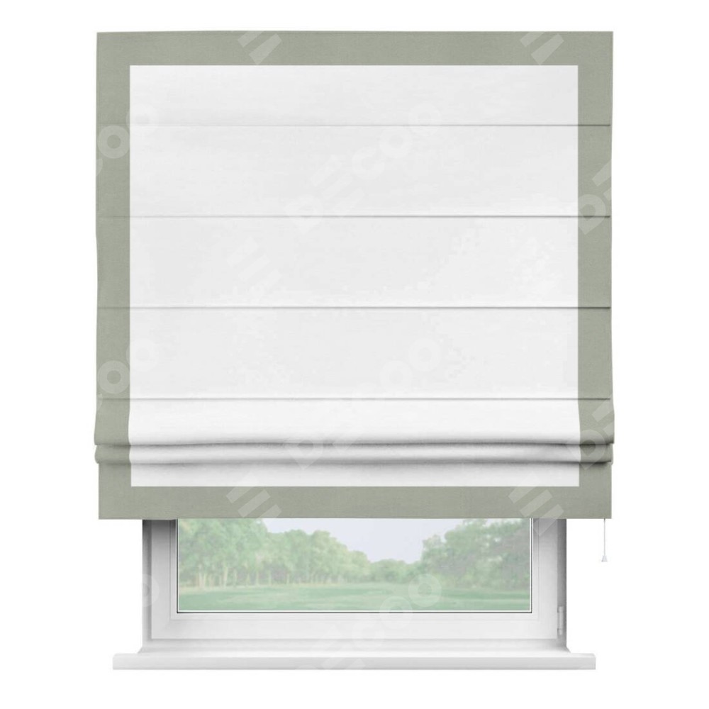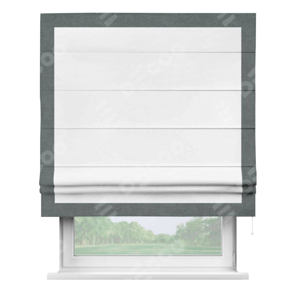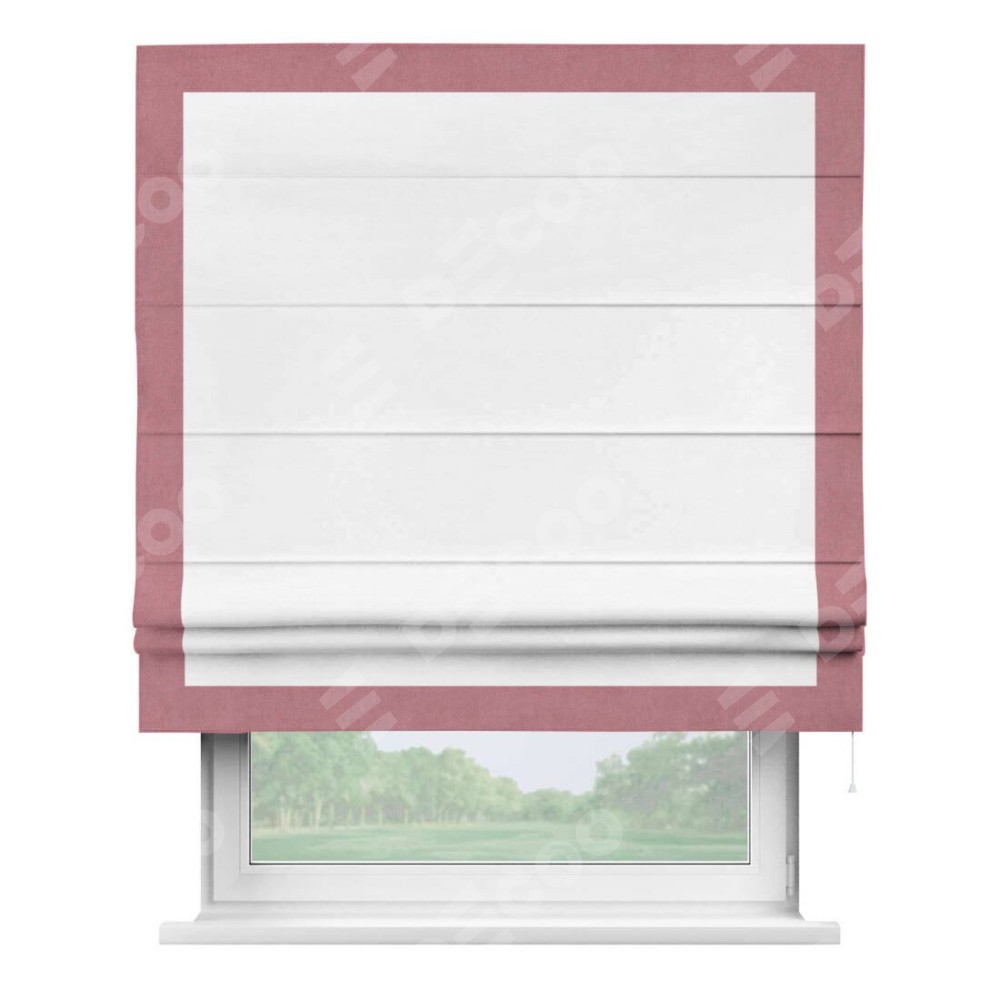Римская штора производителя «Cortin», используется для проёма, пошита из ткани вельвет дымчато-белый, артикул ткани 85535. Отделка шторы кантом «Чесс», ткань для канта используется из вельвета разной расцветки на выбор. Имеет универсальный механизм и подходит для монтажа: на потолок, на стену и в нишу.