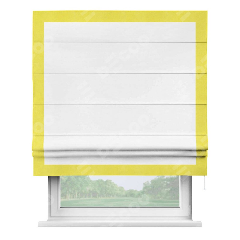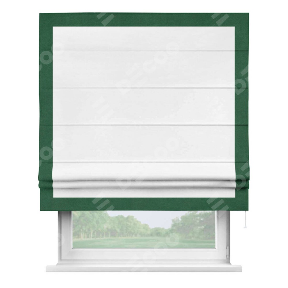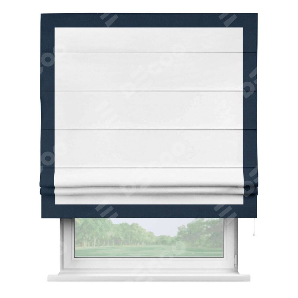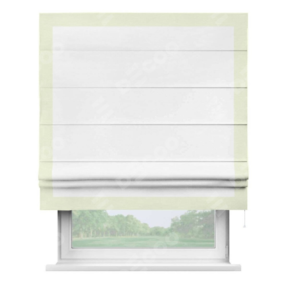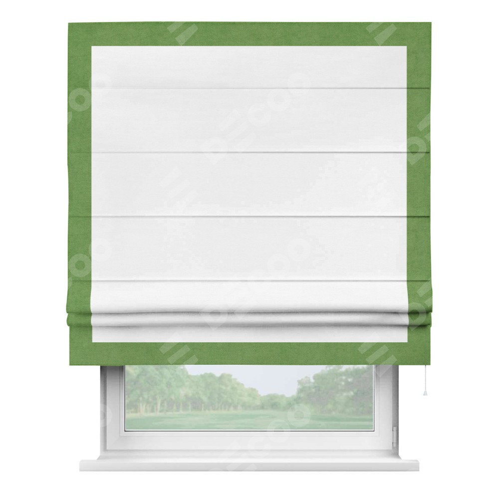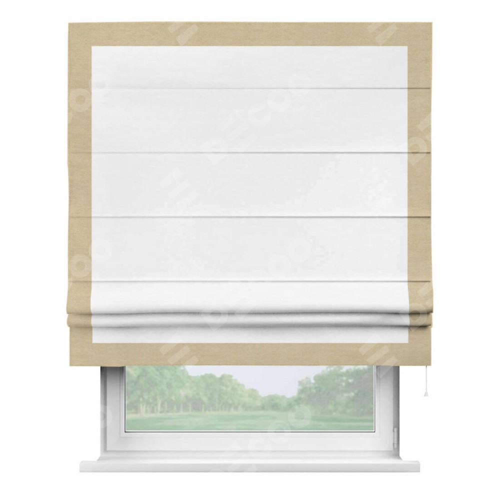 Римская штора производителя «Cortin», используется для проёма, пошита из ткани вельвет дымчато-белый, артикул ткани 85535. Отделка шторы кантом «Чесс», ткань для канта используется из вельвета разной расцветки на выбор. Имеет универсальный механизм и подходит для монтажа: на потолок, на стену и в нишу.