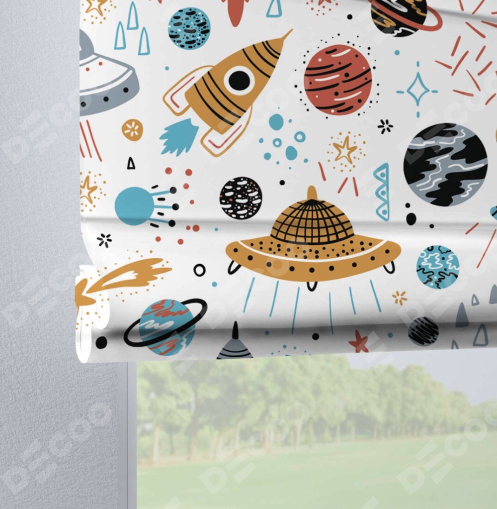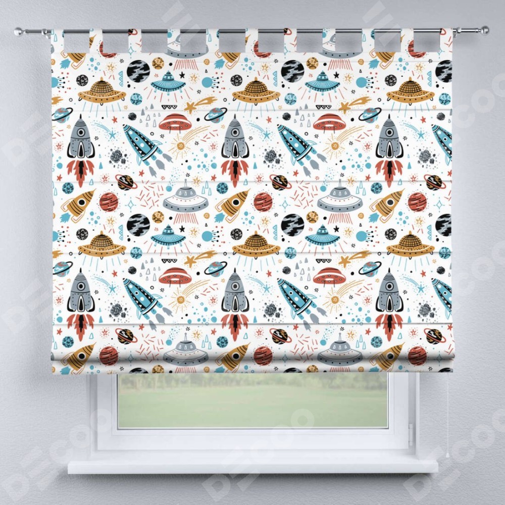 Римская штора производителя «Cortin», используется для проёма, пошита из ткани блэкаут с нанесением сублимационной печати «Космическое приключение». Данная модель пошита на петлях, комплектуется на выбор круглым карнизом и подходит для монтажа на стену. Римская штора на петлях имеет простую систему регулировки высоты, отличительным преимуществом данной модели является простой способ монтажа. Достаточно повесить ее на трубу и штора готова!