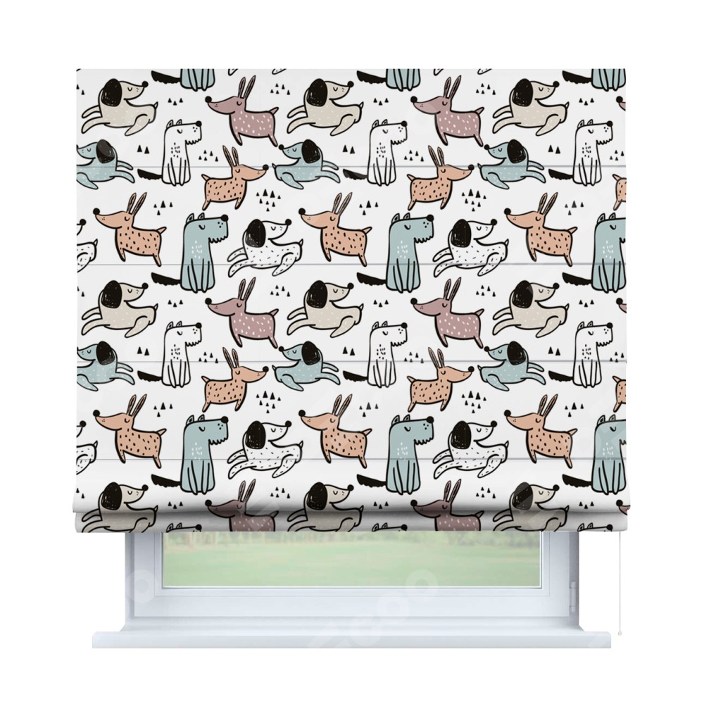 Римская штора производителя «Cortin», используется для проёма, пошита из ткани блэкаут с нанесением сублимационной печати «Очаровательные щеночки». Имеет универсальный механизм и подходит для монтажа: на потолок, на стену и в нишу.