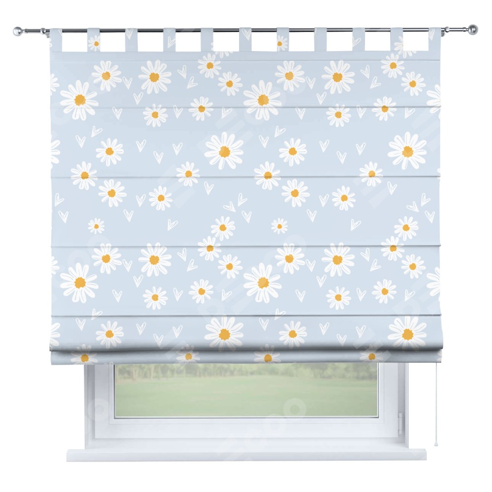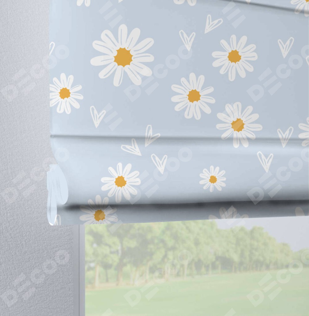 Римская штора производителя «Cortin», используется для проёма, пошита из ткани блэкаут с нанесением сублимационной печати «Летние ромашки». Данная модель пошита на петлях, комплектуется на выбор круглым карнизом и подходит для монтажа на стену. Римская штора на петлях имеет простую систему регулировки высоты, отличительным преимуществом данной модели является простой способ монтажа. Достаточно повесить ее на трубу и штора готова!