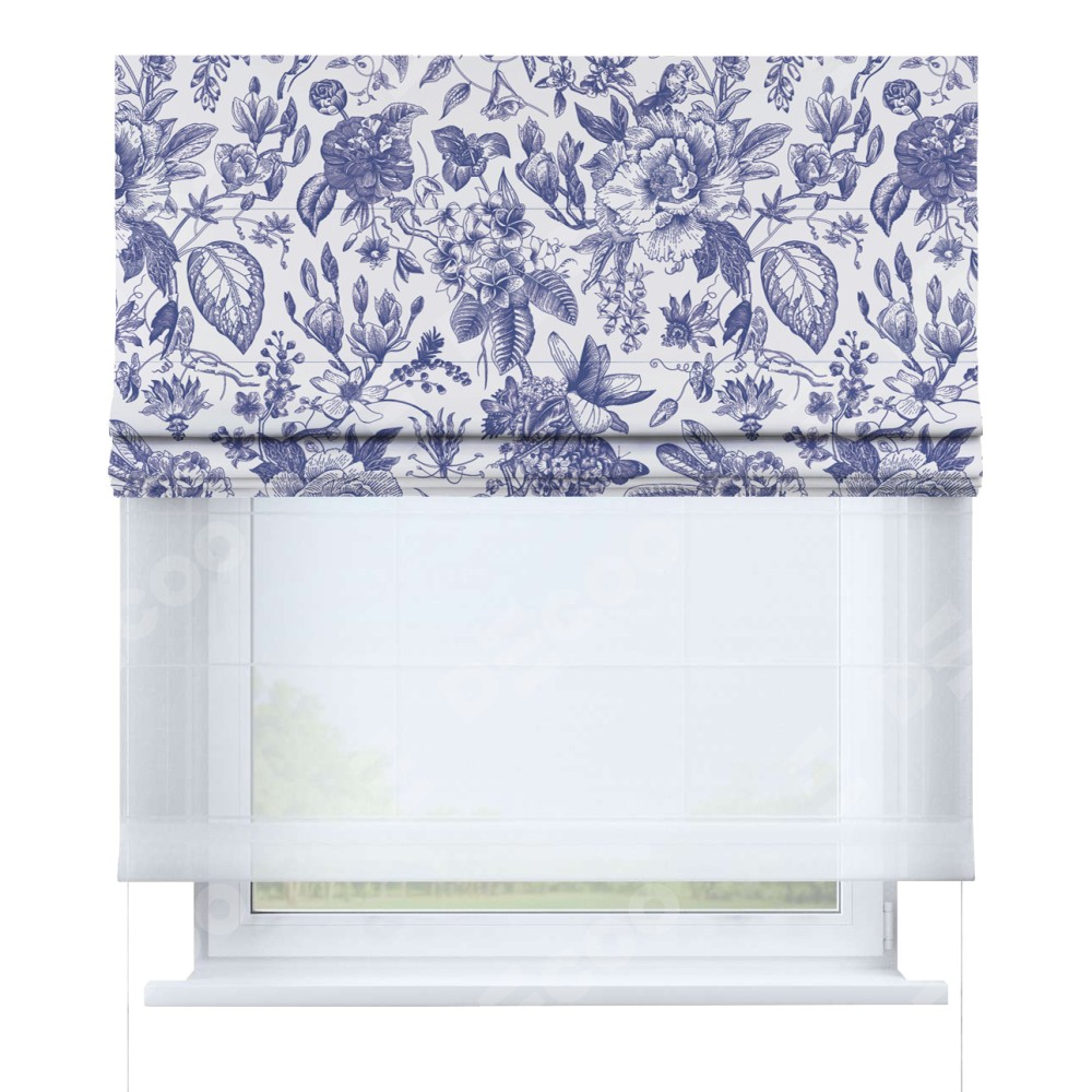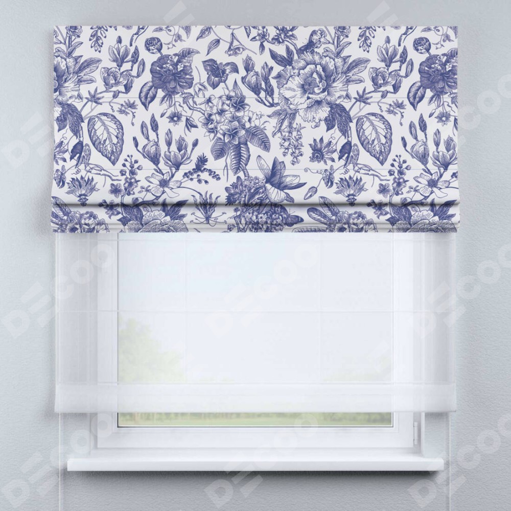 Римская штора день-ночь производителя «Cortin», используется для проёма, пошита из двух полотен, с лицевой блэкаут с нанесением сублимационной печати «Прованс в синем», вторая ткань тюль (по стандарту комплектуется тюль белого цвета артикул V-01). Имеет универсальный механизм и подходит для монтажа: на потолок, на стену и в нишу.