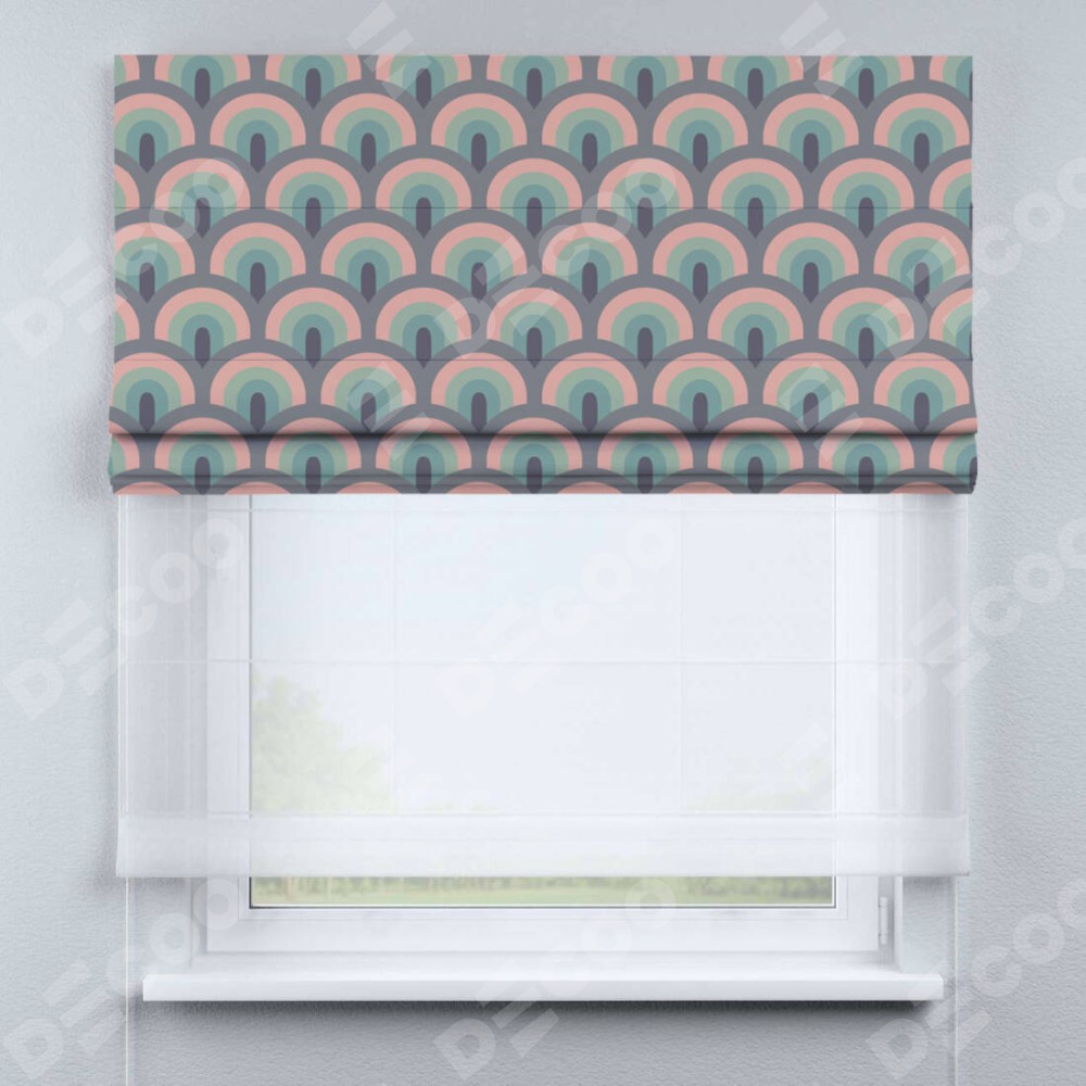 Римская штора день-ночь производителя «Cortin», используется для проёма, пошита из двух полотен, с лицевой блэкаут с нанесением сублимационной печати «Ретро орнамент», вторая ткань тюль (по стандарту комплектуется тюль белого цвета артикул V-01). Имеет универсальный механизм и подходит для монтажа: на потолок, на стену и в нишу.