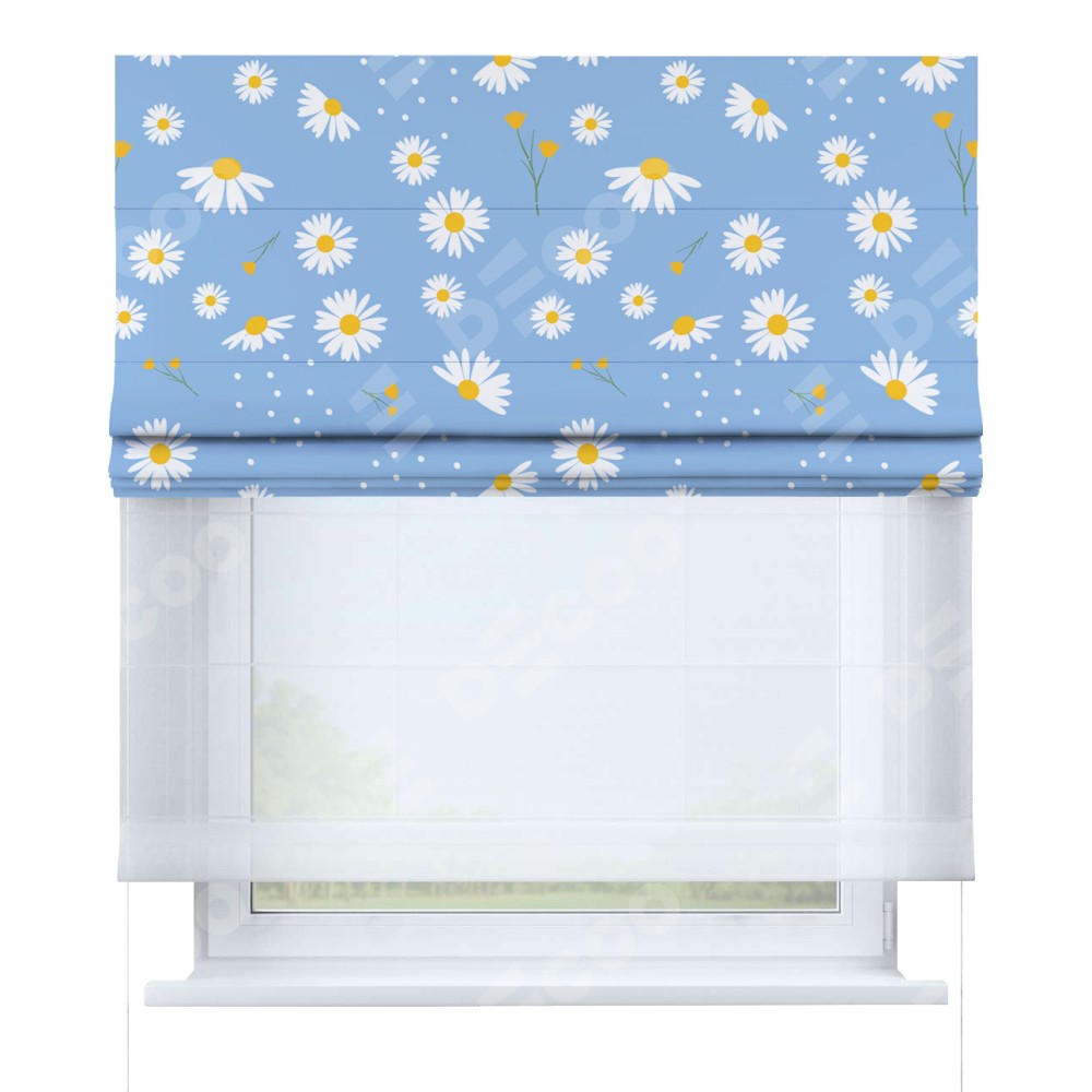 Римская штора день-ночь производителя «Cortin», используется для проёма, пошита из двух полотен, с лицевой блэкаут с нанесением сублимационной печати «Ромашки на голубом», вторая ткань тюль (по стандарту комплектуется тюль белого цвета артикул V-01). Имеет универсальный механизм и подходит для монтажа: на потолок, на стену и в нишу.