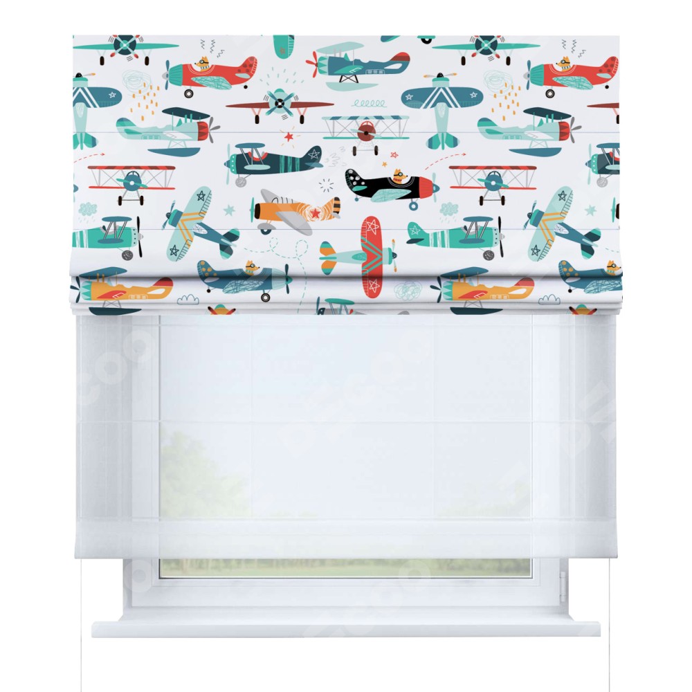 Римская штора день-ночь производителя «Cortin», используется для проёма, пошита из двух полотен, с лицевой блэкаут с нанесением сублимационной печати «Самолёты и пилоты», вторая ткань тюль (по стандарту комплектуется тюль белого цвета артикул V-01). Имеет универсальный механизм и подходит для монтажа: на потолок, на стену и в нишу.