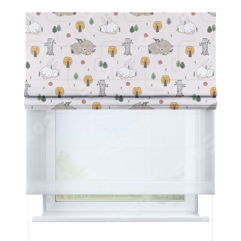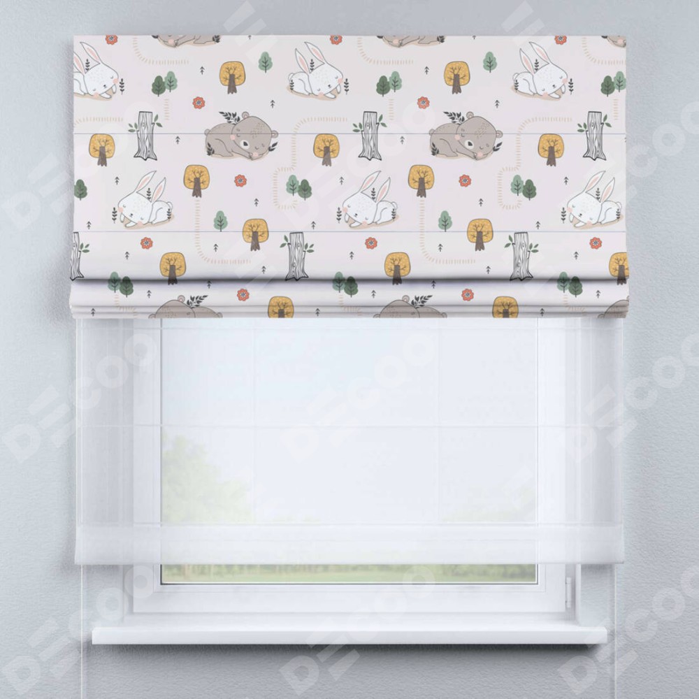 Римская штора день-ночь производителя «Cortin», используется для проёма, пошита из двух полотен, с лицевой блэкаут с нанесением сублимационной печати «Сладкие сны», вторая ткань тюль (по стандарту комплектуется тюль белого цвета артикул V-01). Имеет универсальный механизм и подходит для монтажа: на потолок, на стену и в нишу.