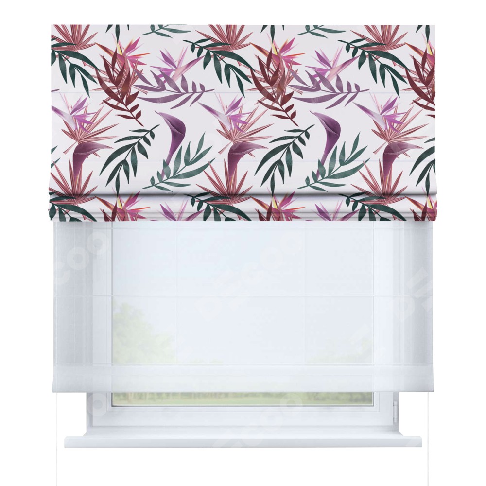 Римская штора день-ночь производителя «Cortin», используется для проёма, пошита из двух полотен, с лицевой блэкаут с нанесением сублимационной печати «Тропические побеги», вторая ткань тюль (по стандарту комплектуется тюль белого цвета артикул V-01). Имеет универсальный механизм и подходит для монтажа: на потолок, на стену и в нишу.