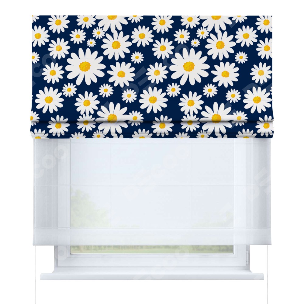 Римская штора день-ночь производителя «Cortin», используется для проёма, пошита из двух полотен, с лицевой блэкаут с нанесением сублимационной печати «Яркие ромашки», вторая ткань тюль (по стандарту комплектуется тюль белого цвета артикул V-01). Имеет универсальный механизм и подходит для монтажа: на потолок, на стену и в нишу.