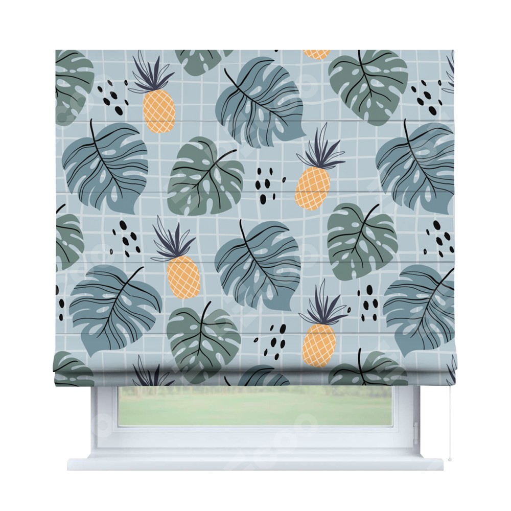 Римская штора производителя «Cortin», используется для проёма, пошита из ткани блэкаут с нанесением сублимационной печати «Ананасы и листья монстеры». Имеет универсальный механизм и подходит для монтажа: на потолок, на стену и в нишу.