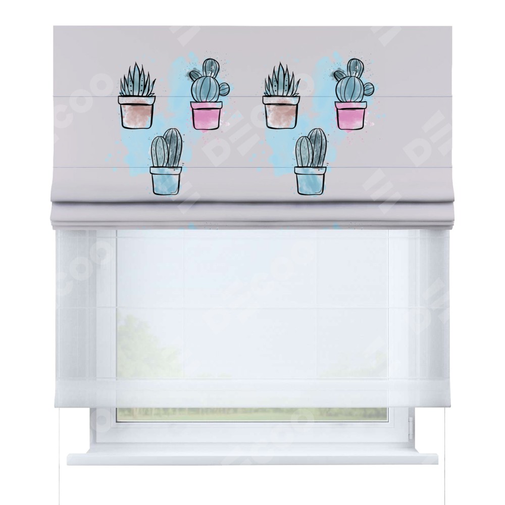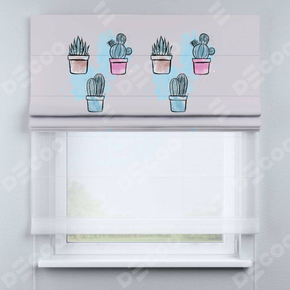 Римская штора день-ночь производителя «Cortin», используется для проёма, пошита из двух полотен, с лицевой блэкаут с нанесением сублимационной печати «Кактусовая оранжерея», вторая ткань тюль (по стандарту комплектуется тюль белого цвета артикул V-01). Имеет универсальный механизм и подходит для монтажа: на потолок, на стену и в нишу.