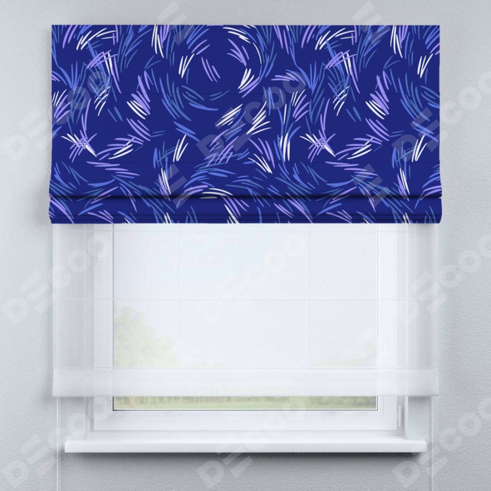 Римская штора день-ночь производителя «Cortin», используется для проёма, пошита из двух полотен, с лицевой блэкаут с нанесением сублимационной печати «Синяя абстракция», вторая ткань тюль (по стандарту комплектуется тюль белого цвета артикул V-01). Имеет универсальный механизм и подходит для монтажа: на потолок, на стену и в нишу.