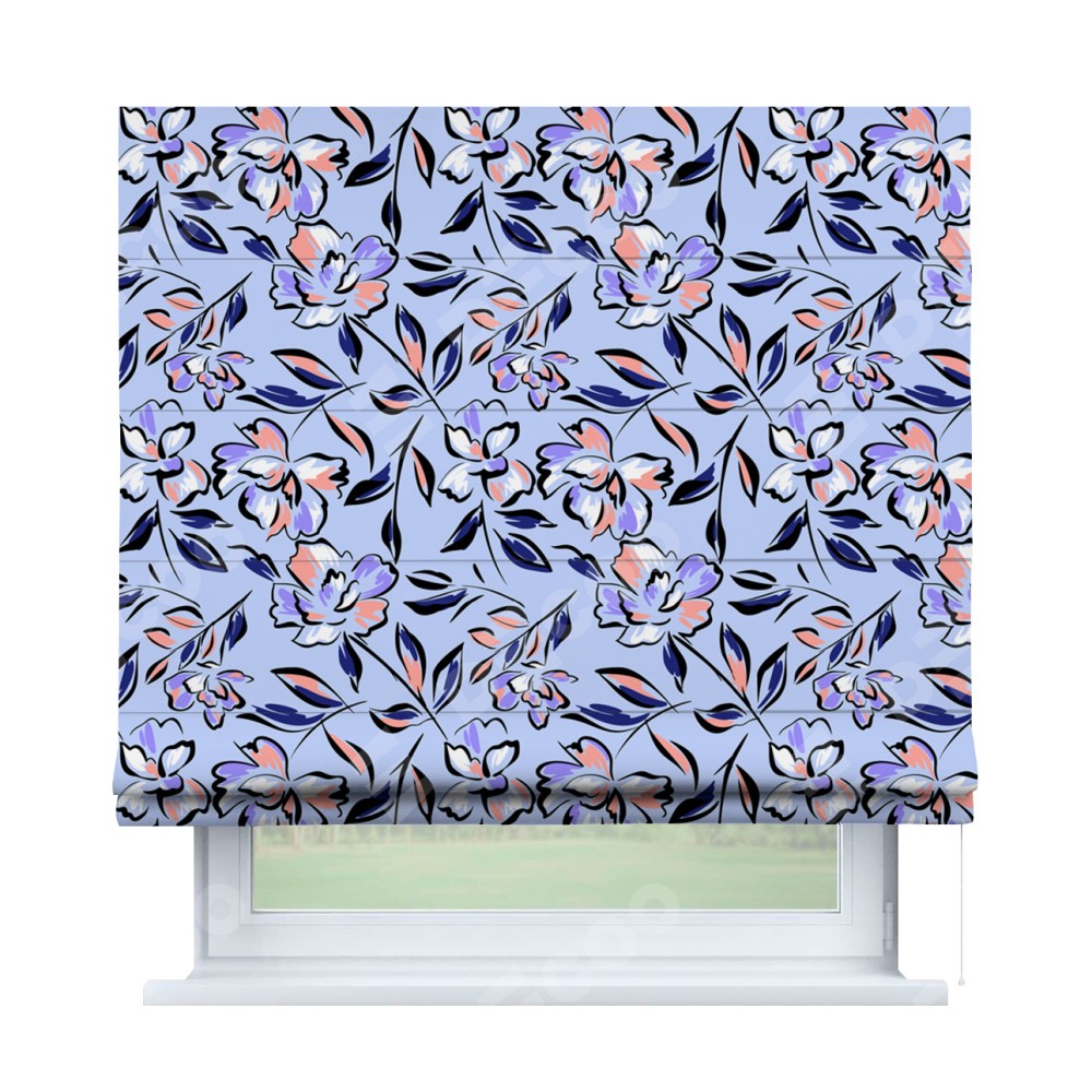Римская штора производителя «Cortin», используется для проёма, пошита из ткани блэкаут с нанесением сублимационной печати «Цветочки и листочки». Имеет универсальный механизм и подходит для монтажа: на потолок, на стену и в нишу.