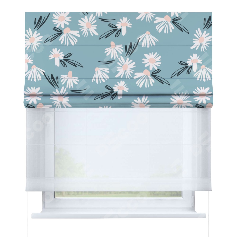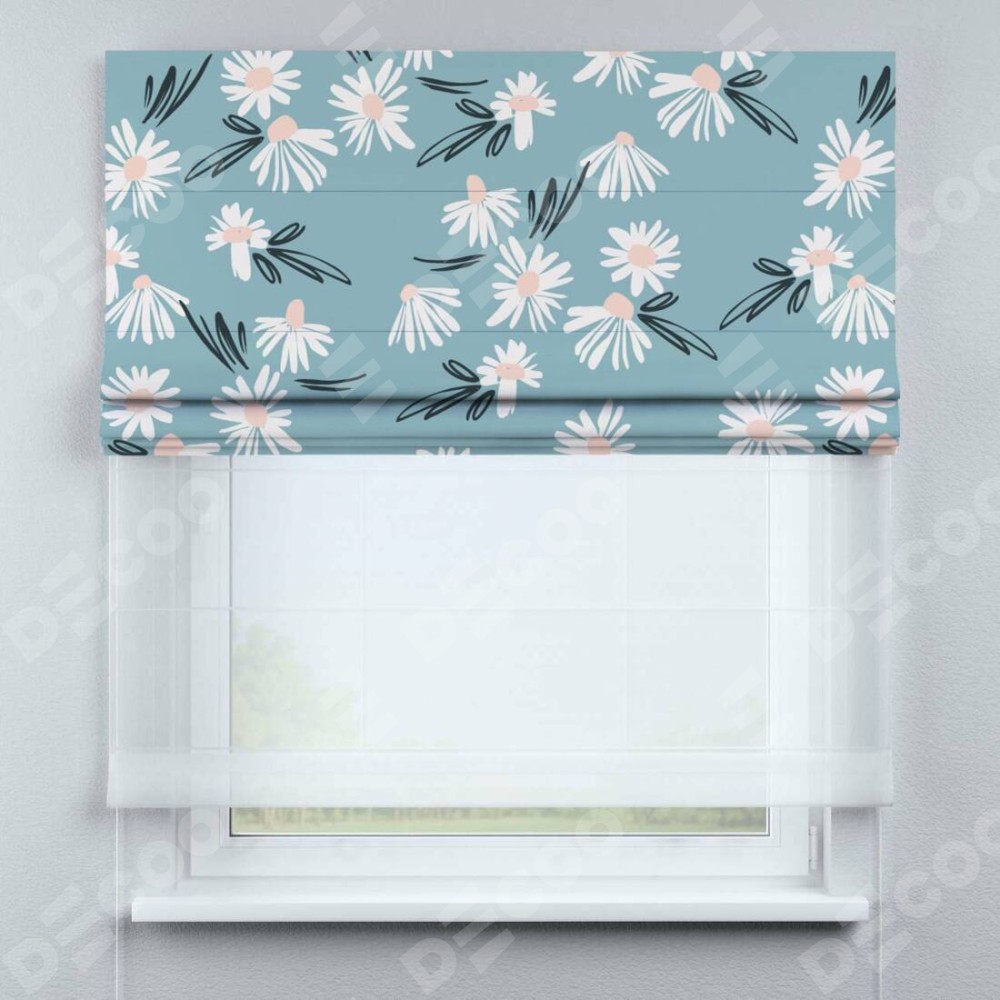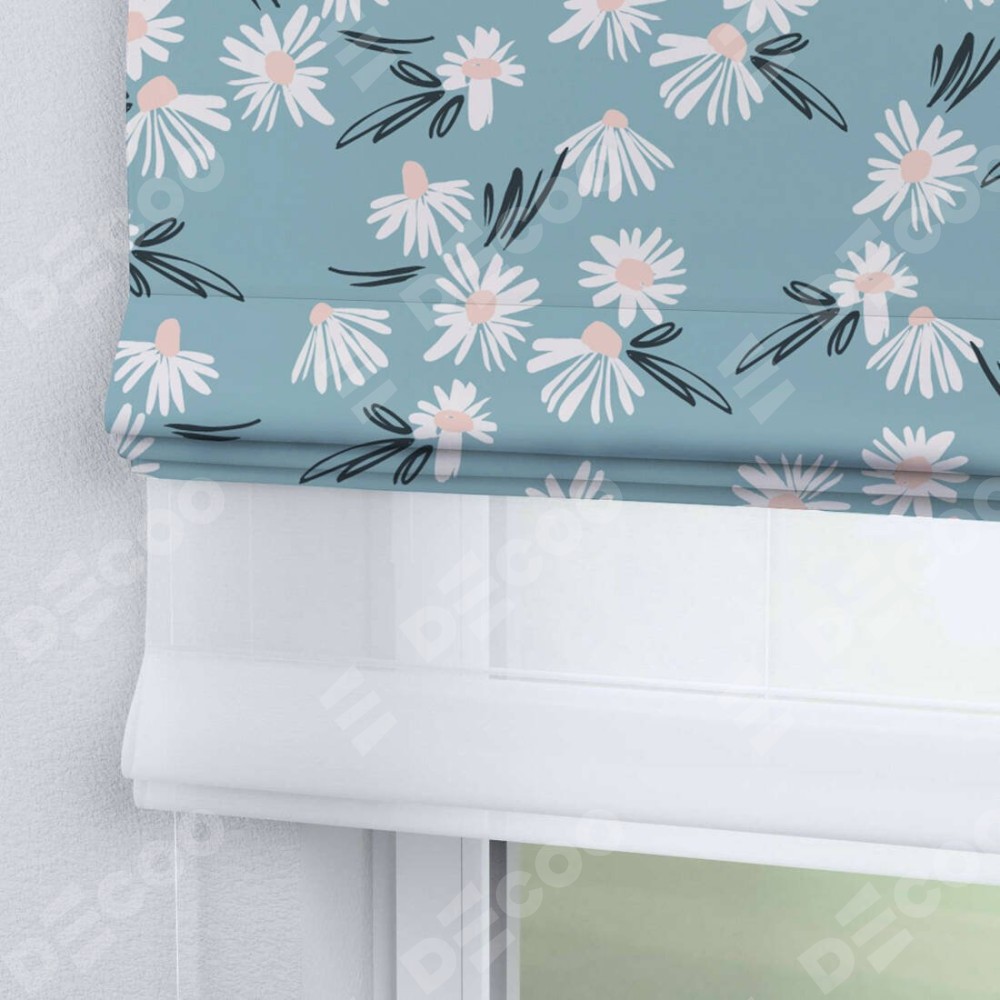Римская штора день-ночь производителя «Cortin», используется для проёма, пошита из двух полотен, с лицевой блэкаут с нанесением сублимационной печати «Чудесные ромашки», вторая ткань тюль (по стандарту комплектуется тюль белого цвета артикул V-01). Имеет универсальный механизм и подходит для монтажа: на потолок, на стену и в нишу.