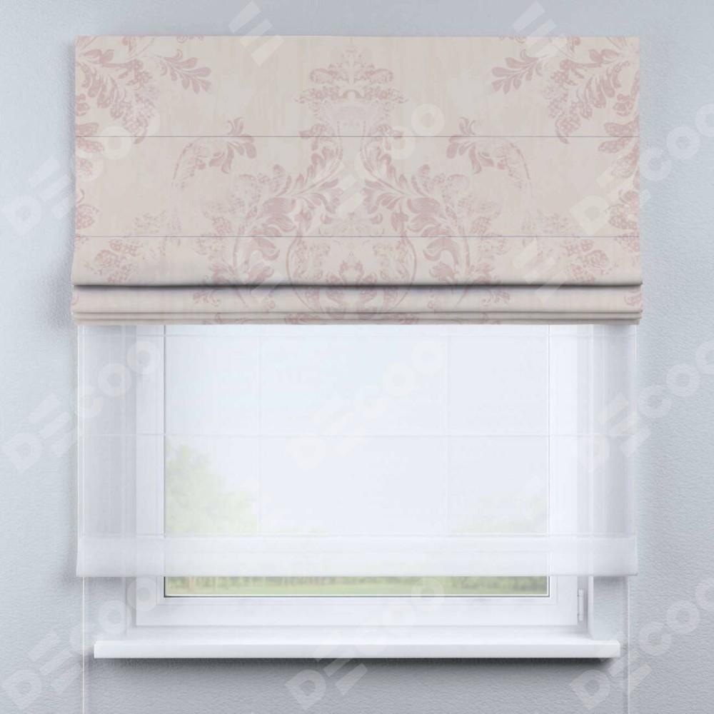 Римская штора день-ночь производителя «Cortin», используется для проёма, пошита из двух полотен, с лицевой блэкаут с нанесением сублимационной печати «Винтажный узор пудровый», вторая ткань тюль (по стандарту комплектуется тюль белого цвета артикул V-01). Имеет универсальный механизм и подходит для монтажа: на потолок, на стену и в нишу.