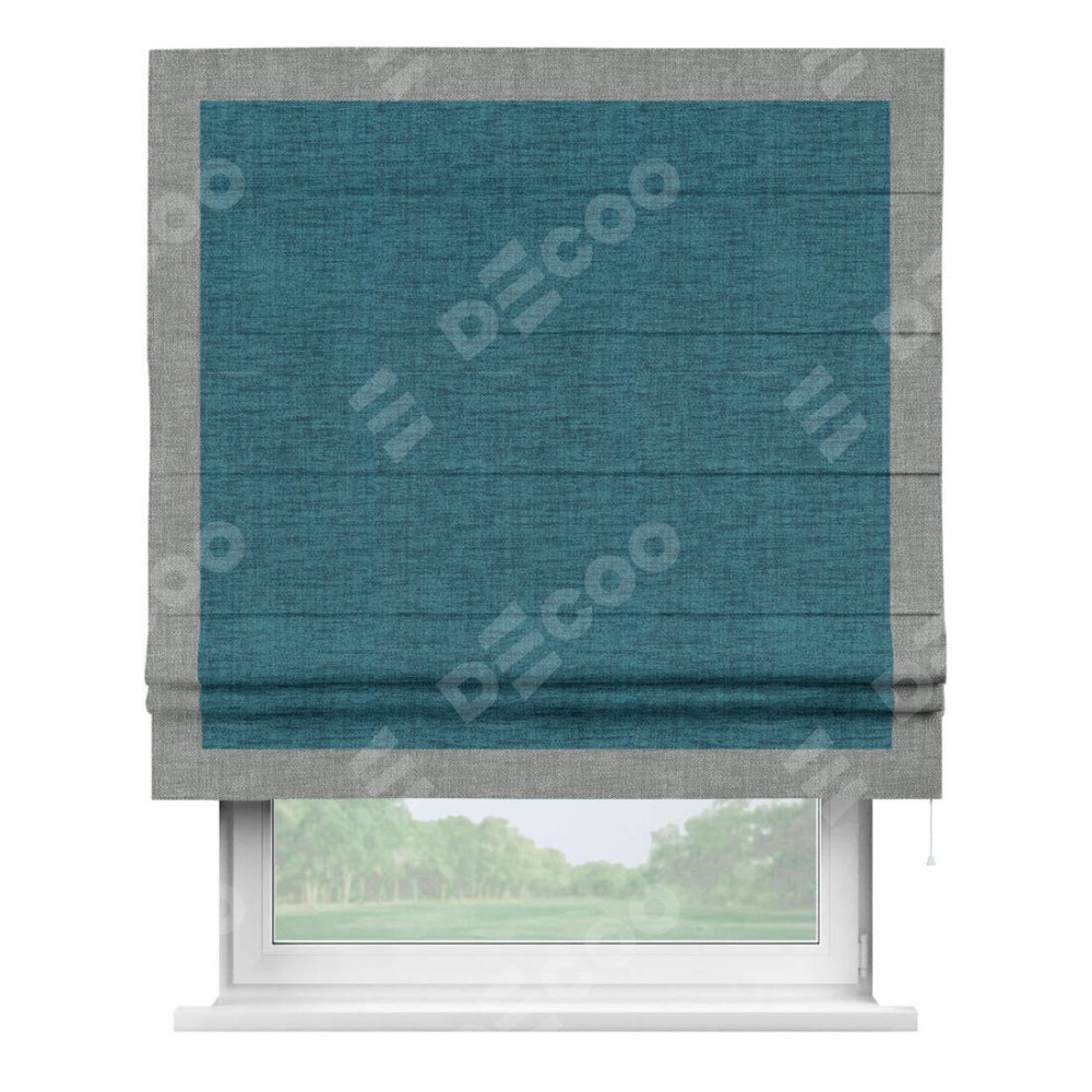 Римская штора производителя «Cortin», используется для проёма, пошита из ткани рогожка димаут синий, артикул 80422. Отделка шторы кантом «Чесс», ткань для канта используется из рогожки димаут разной расцветки на выбор. Имеет универсальный механизм и подходит для монтажа: на потолок, на стену и в нишу.