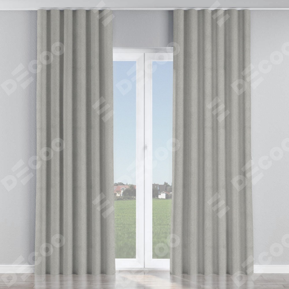 Комплект прямых штор, от производителя «Cortin», пошиты из ткани блэкаут с блеском тёмно-серый, артикул ткани 34634. С изнаночной стороны в верхней части штор пристрачивается шторная лента с декоративными складками «Волна». Обратная сторона основного материала черного цвета, что обеспечивает необходимую светонепроницаемость. Для создания элегантных складок прямые шторы шьются по стандарту с коэффициентом 1:2 (на 100 см. ширины проёма 200 см. ширины ткани).
