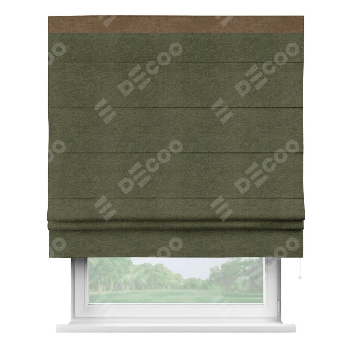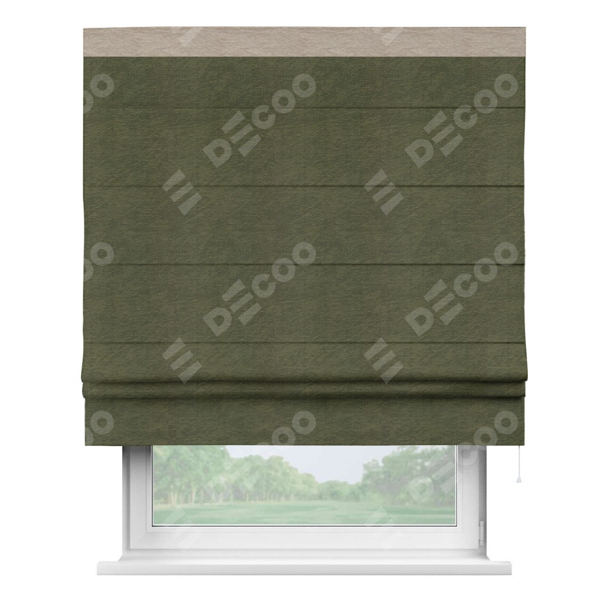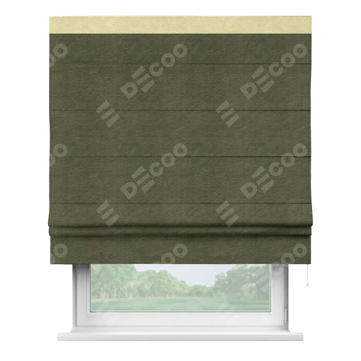 Римская штора производителя «Cortin», используется для проёма, пошита из ткани софт однотонный зелёный, артикул 33110. Отделка шторы кантом «Кинг», ткань для канта используется из софта разной расцветки на выбор. Имеет универсальный механизм и подходит для монтажа: на потолок, на стену и в нишу.