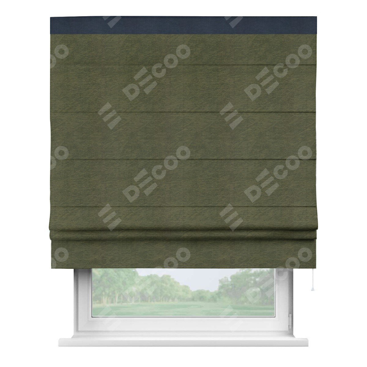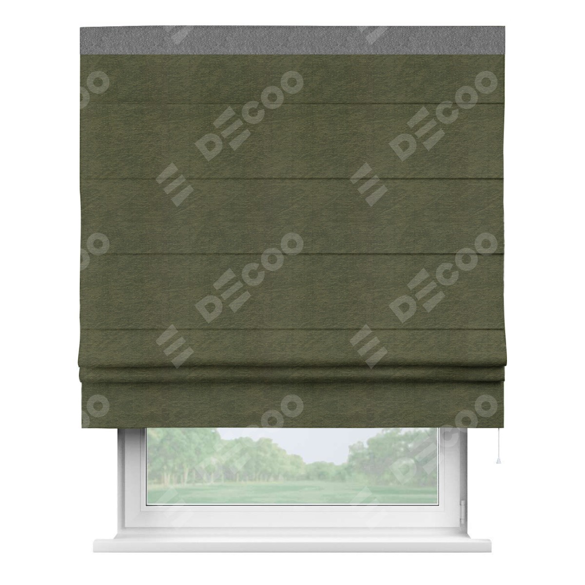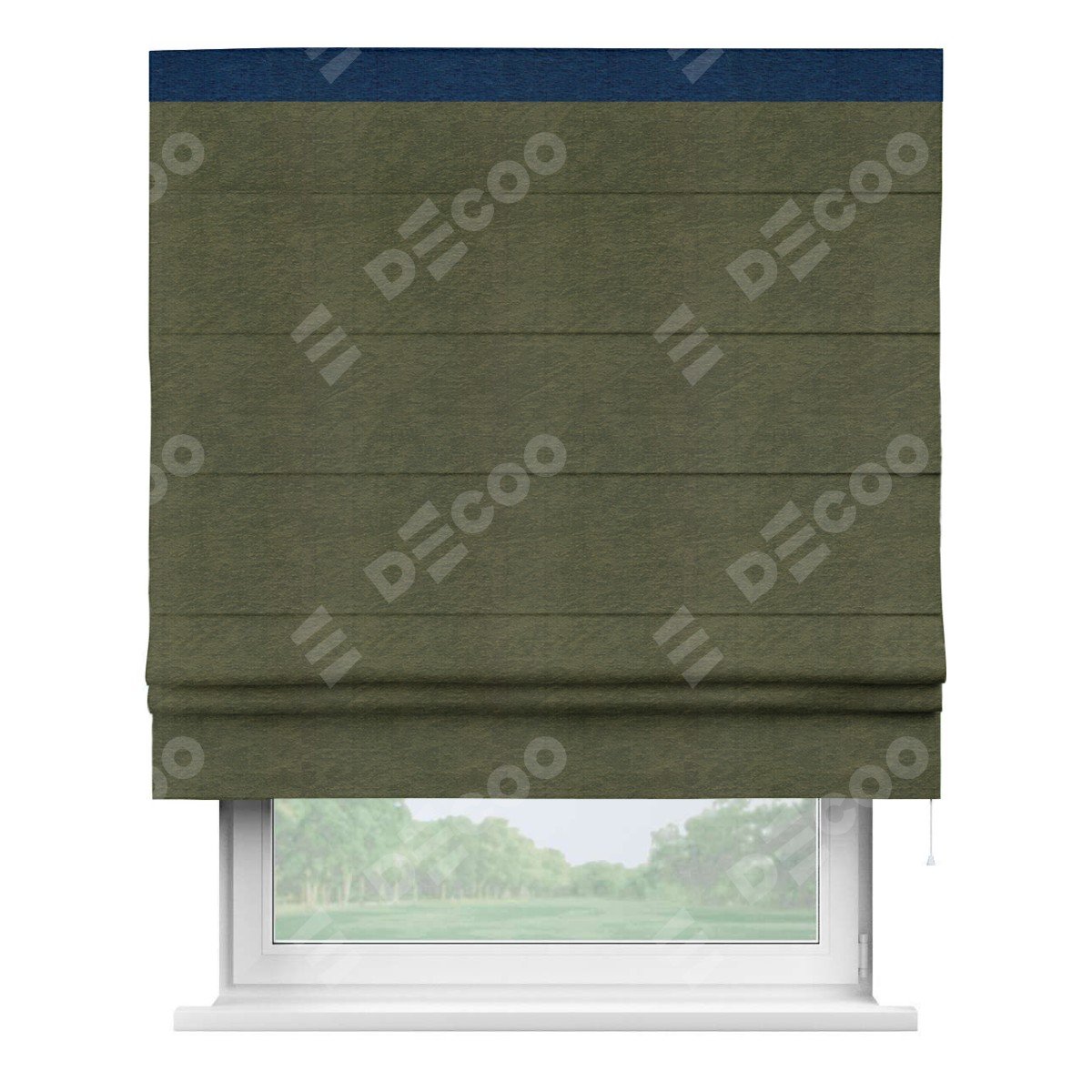 Римская штора производителя «Cortin», используется для проёма, пошита из ткани софт однотонный зелёный, артикул 33110. Отделка шторы кантом «Кинг», ткань для канта используется из софта разной расцветки на выбор. Имеет универсальный механизм и подходит для монтажа: на потолок, на стену и в нишу.