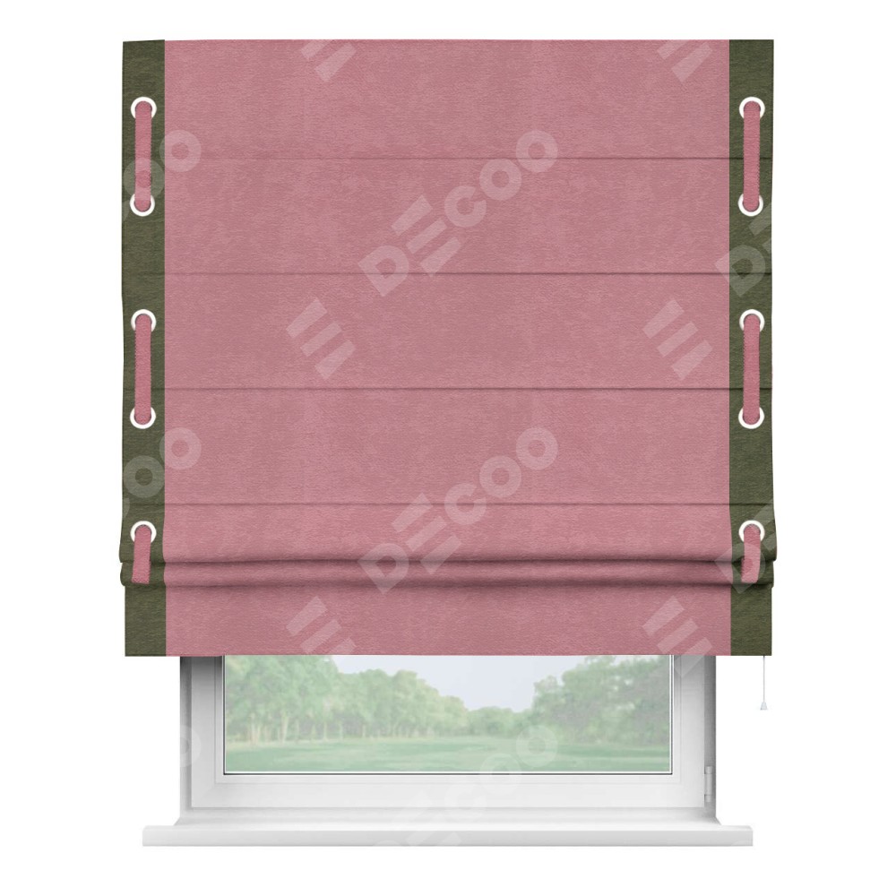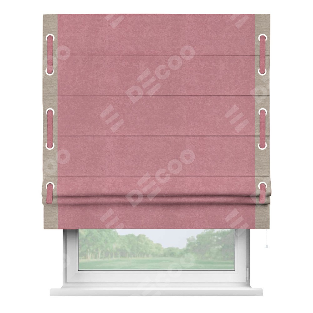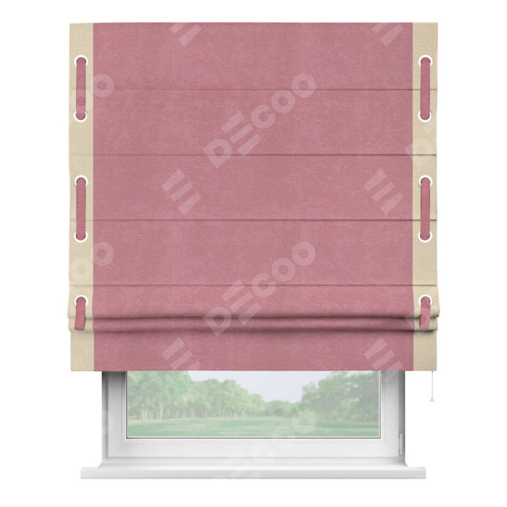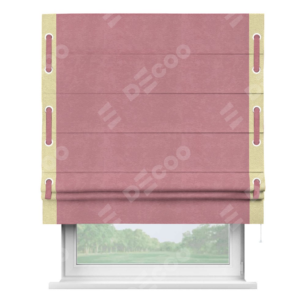 Римская штора производителя «Cortin», используется для проёма, пошита из ткани софт однотонный розовый, артикул 42926. Отделка шторы кантом «Стрим Дуо» на кантах расположены люверсы с пояском, ткань для канта используется из софта разной расцветки на выбор. Ткань для пояска обычно используется из основной ткани шторы, а так же можно сделать из любой расцветки по желанию. Имеет универсальный механизм и подходит для монтажа: на потолок, на стену и в нишу.