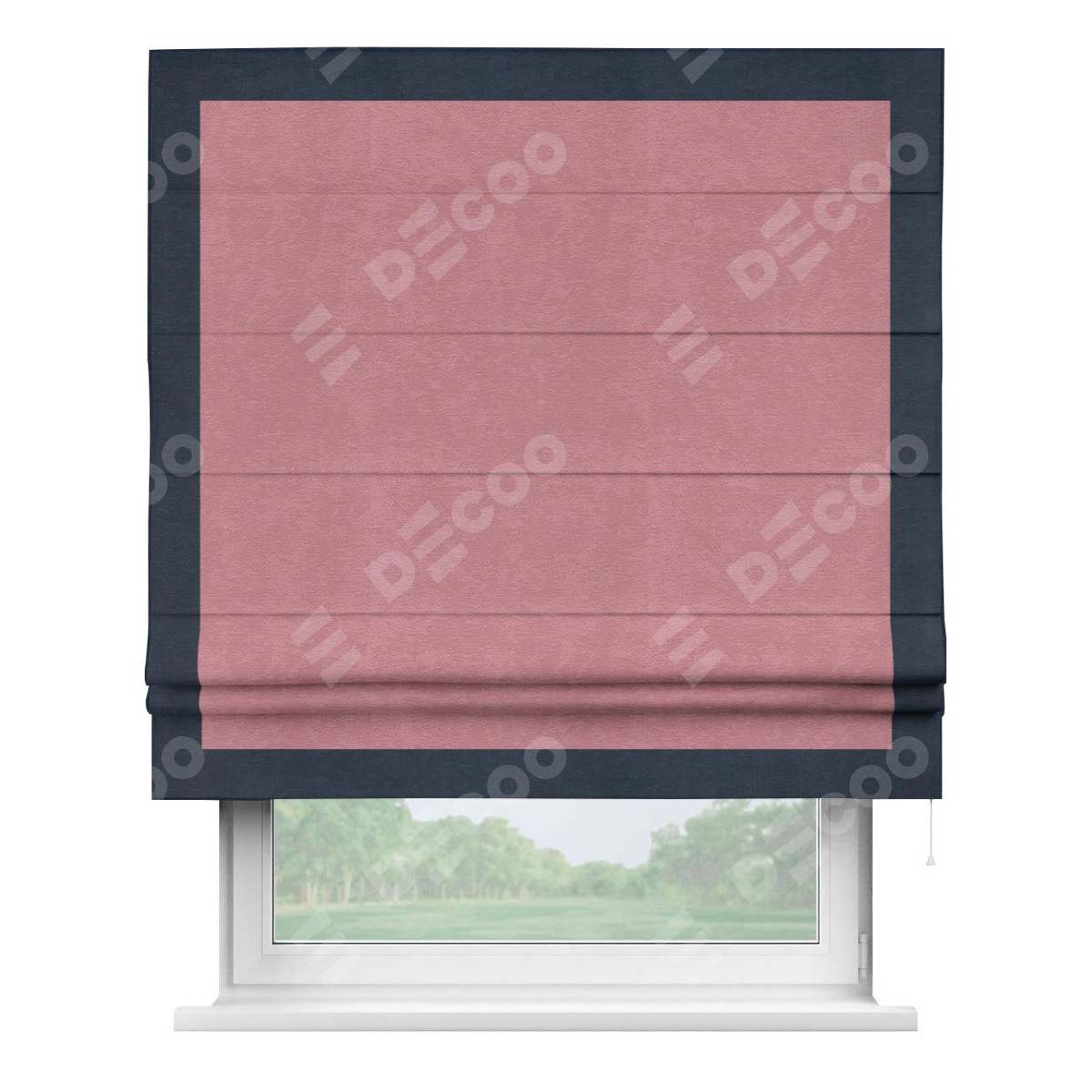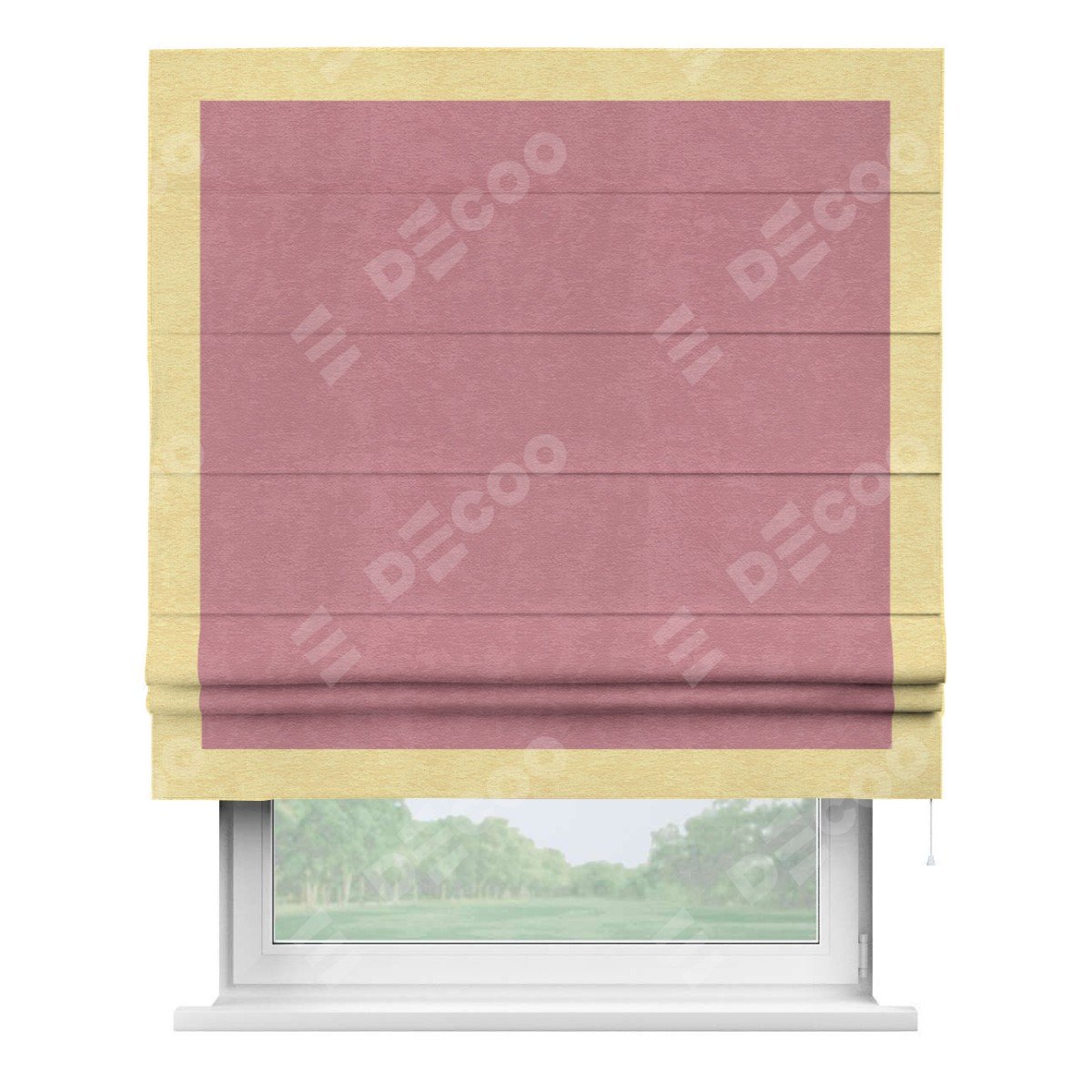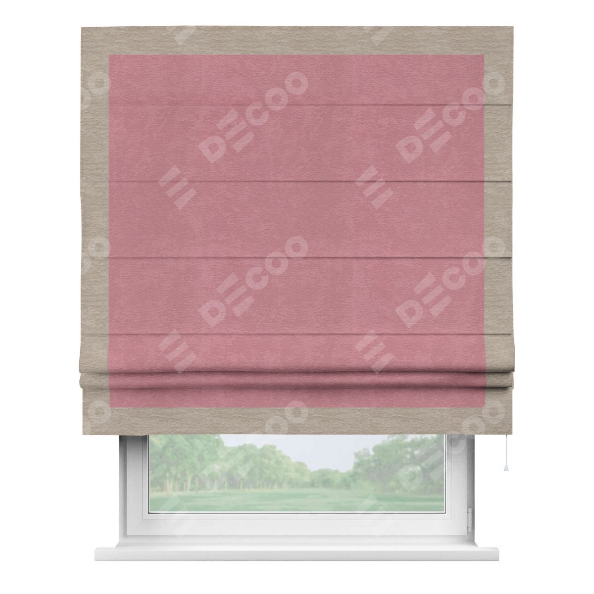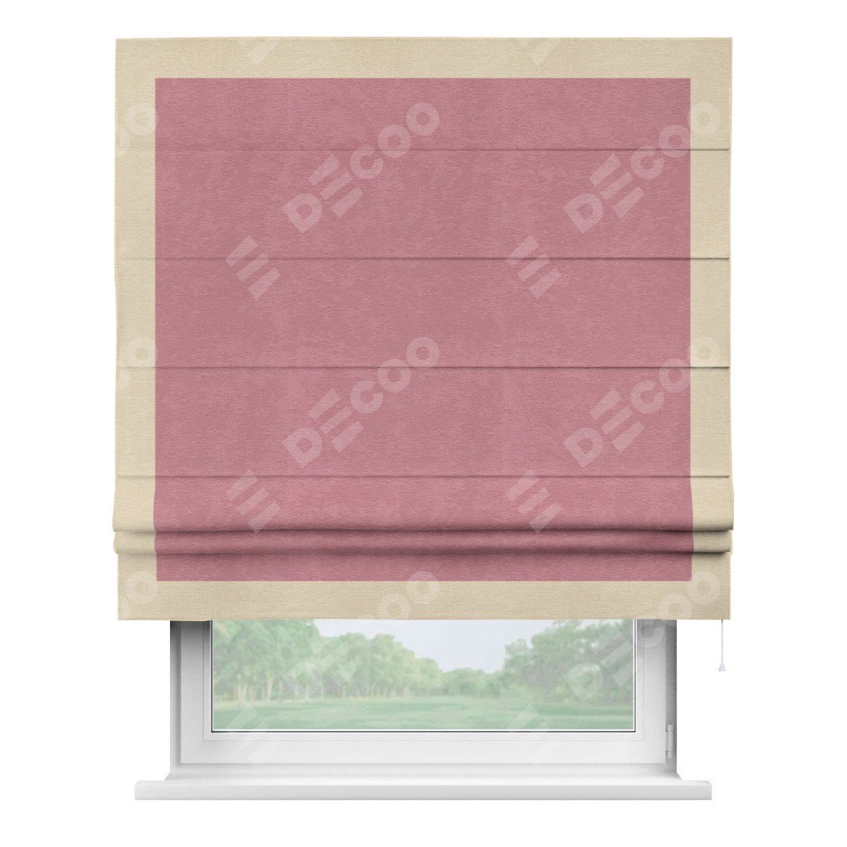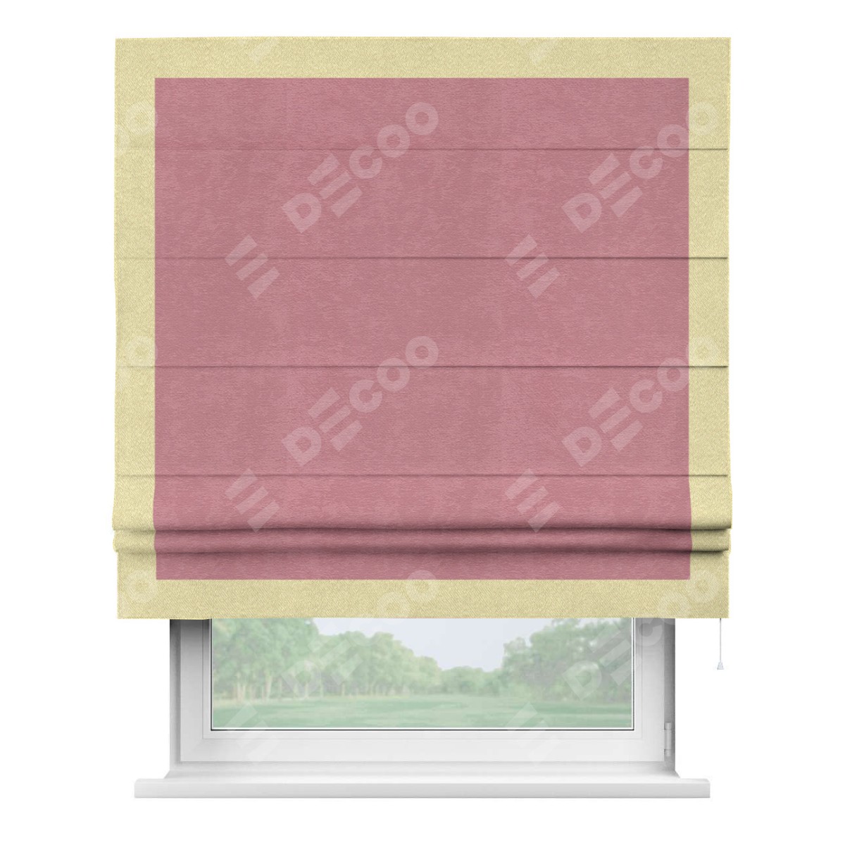 Римская штора производителя «Cortin», используется для проёма, пошита из ткани софт однотонный розовый, артикул 42926. Отделка шторы кантом «Чесс», ткань для канта используется из софта разной расцветки на выбор. Имеет универсальный механизм и подходит для монтажа: на потолок, на стену и в нишу.