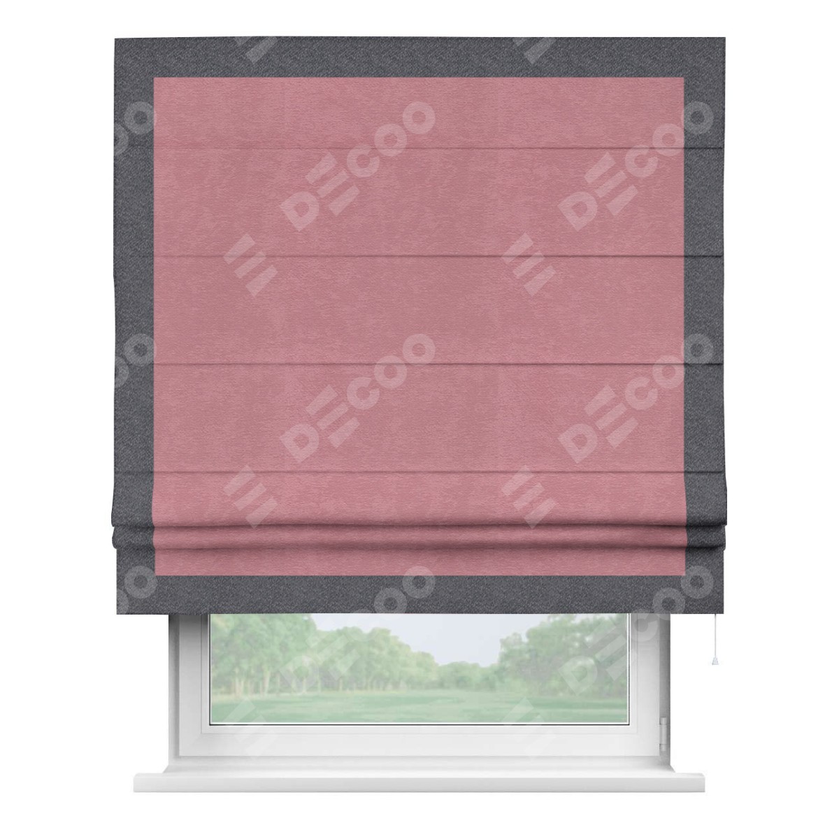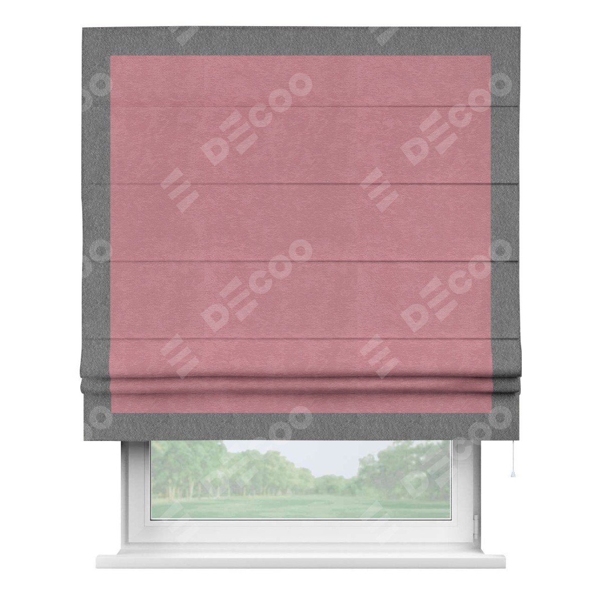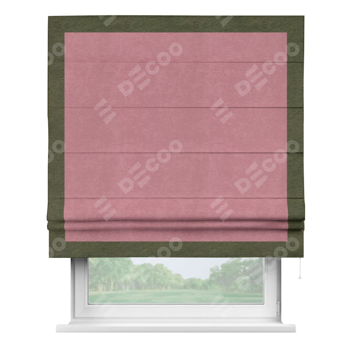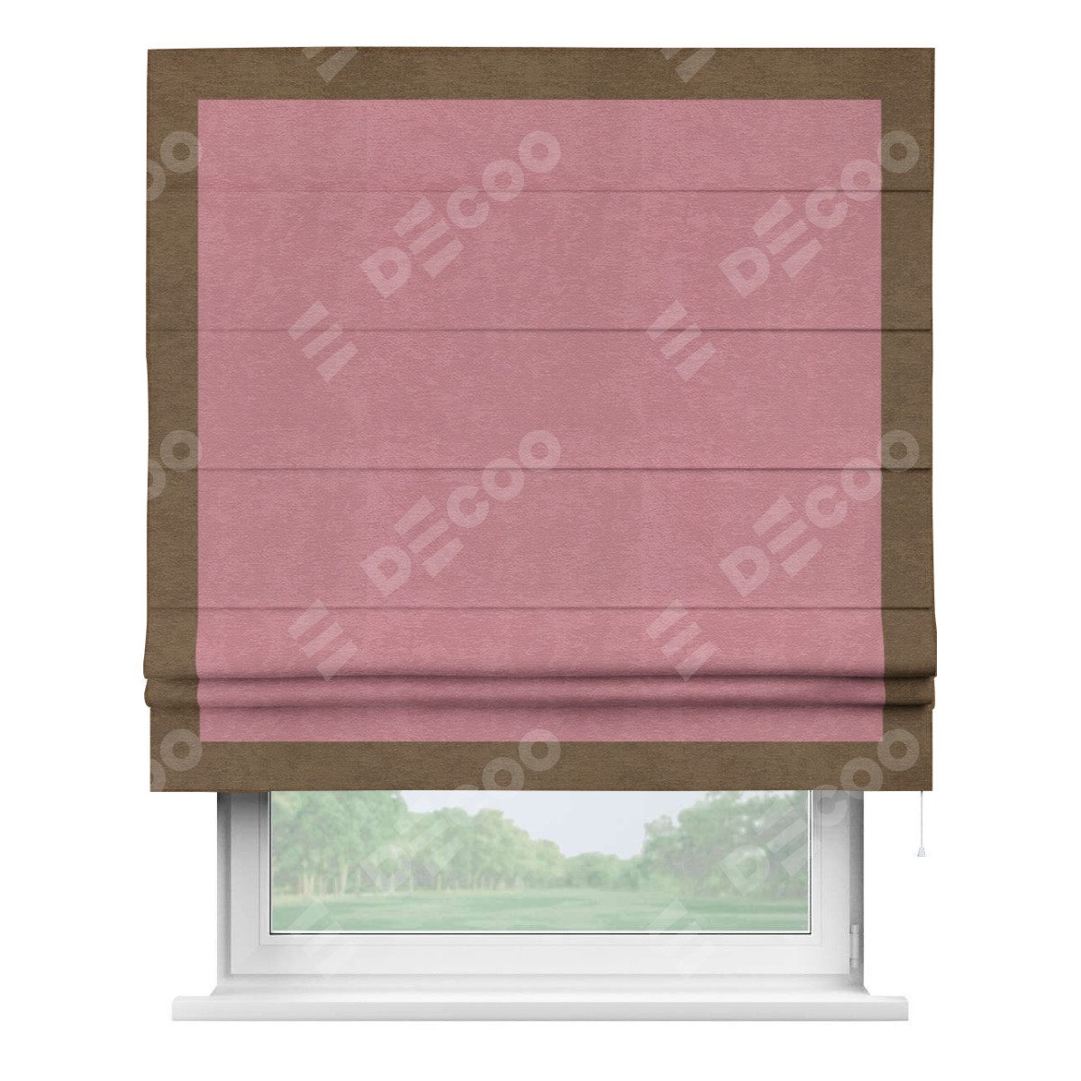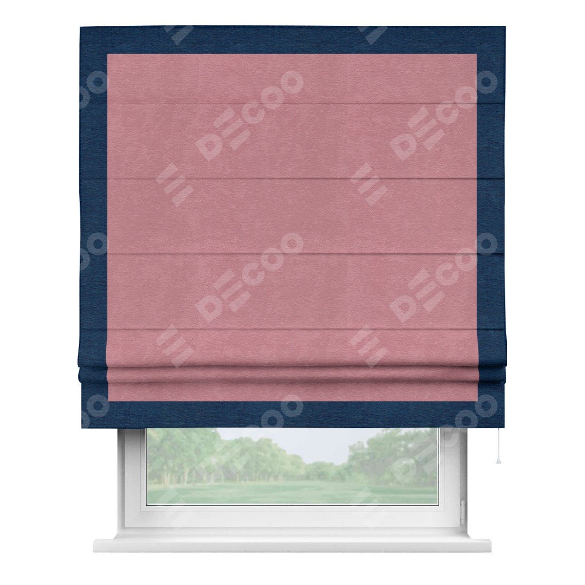Римская штора производителя «Cortin», используется для проёма, пошита из ткани софт однотонный розовый, артикул 42926. Отделка шторы кантом «Чесс», ткань для канта используется из софта разной расцветки на выбор. Имеет универсальный механизм и подходит для монтажа: на потолок, на стену и в нишу.