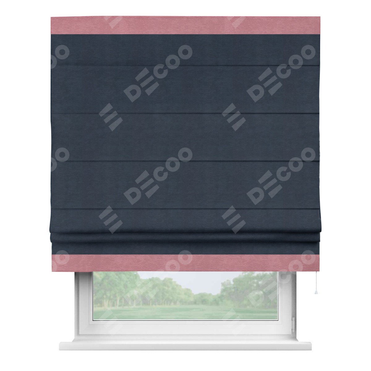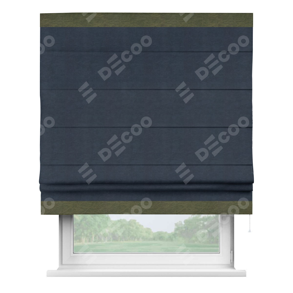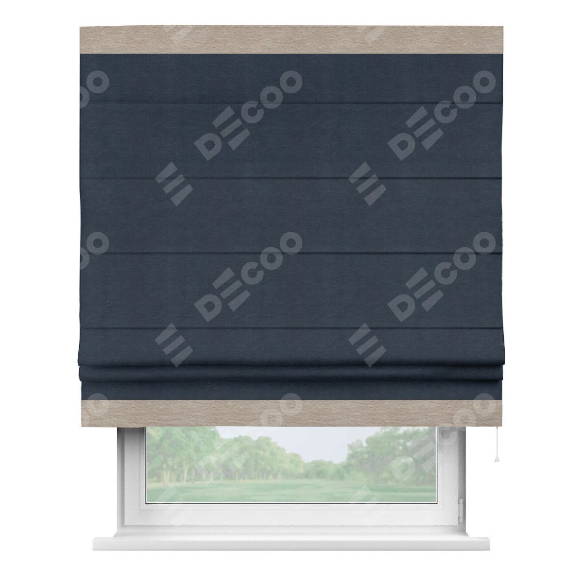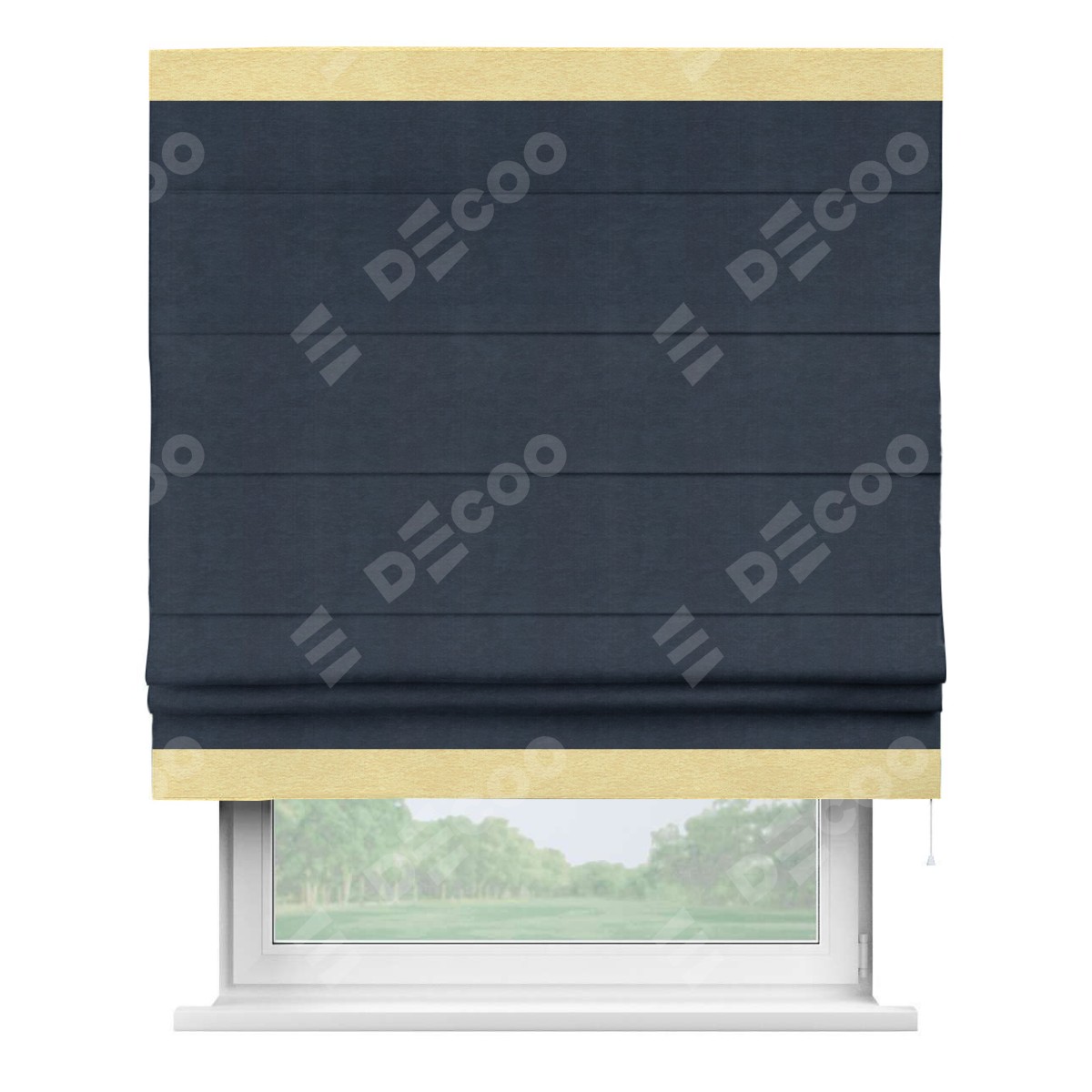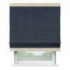 Римская штора производителя «Cortin», используется для проёма, пошита из ткани софт однотонный тёмно-синий, артикул 33111. Отделка шторы кантом «Горизонт», ткань для канта используется из софта разной расцветки на выбор. Имеет универсальный механизм и подходит для монтажа: на потолок, на стену и в нишу.