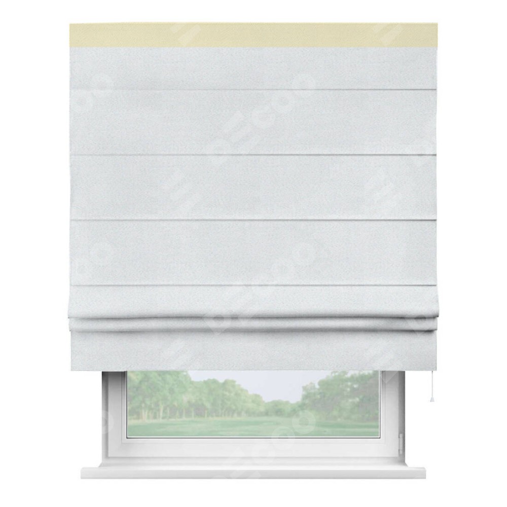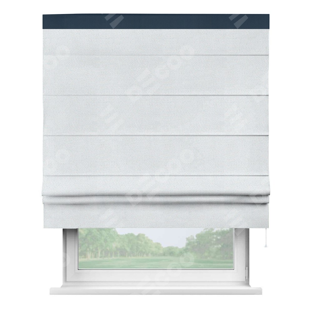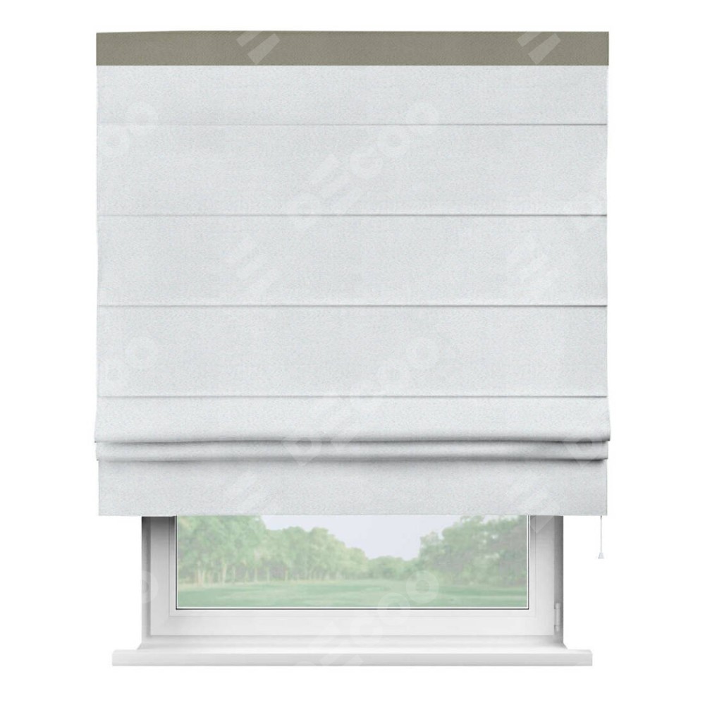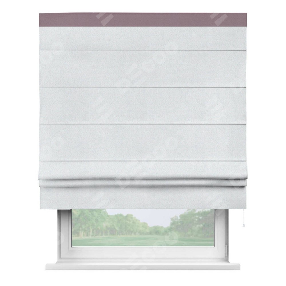 Римская штора производителя «Cortin», используется для проёма, пошита из ткани блэкаут однотонный дымчато-белый, артикул ткани 101. Отделка шторы кантом «Кинг», ткань для канта используется из блэкаута однотонного разной расцветки на выбор. Имеет универсальный механизм и подходит для монтажа: на потолок, на стену и в нишу.