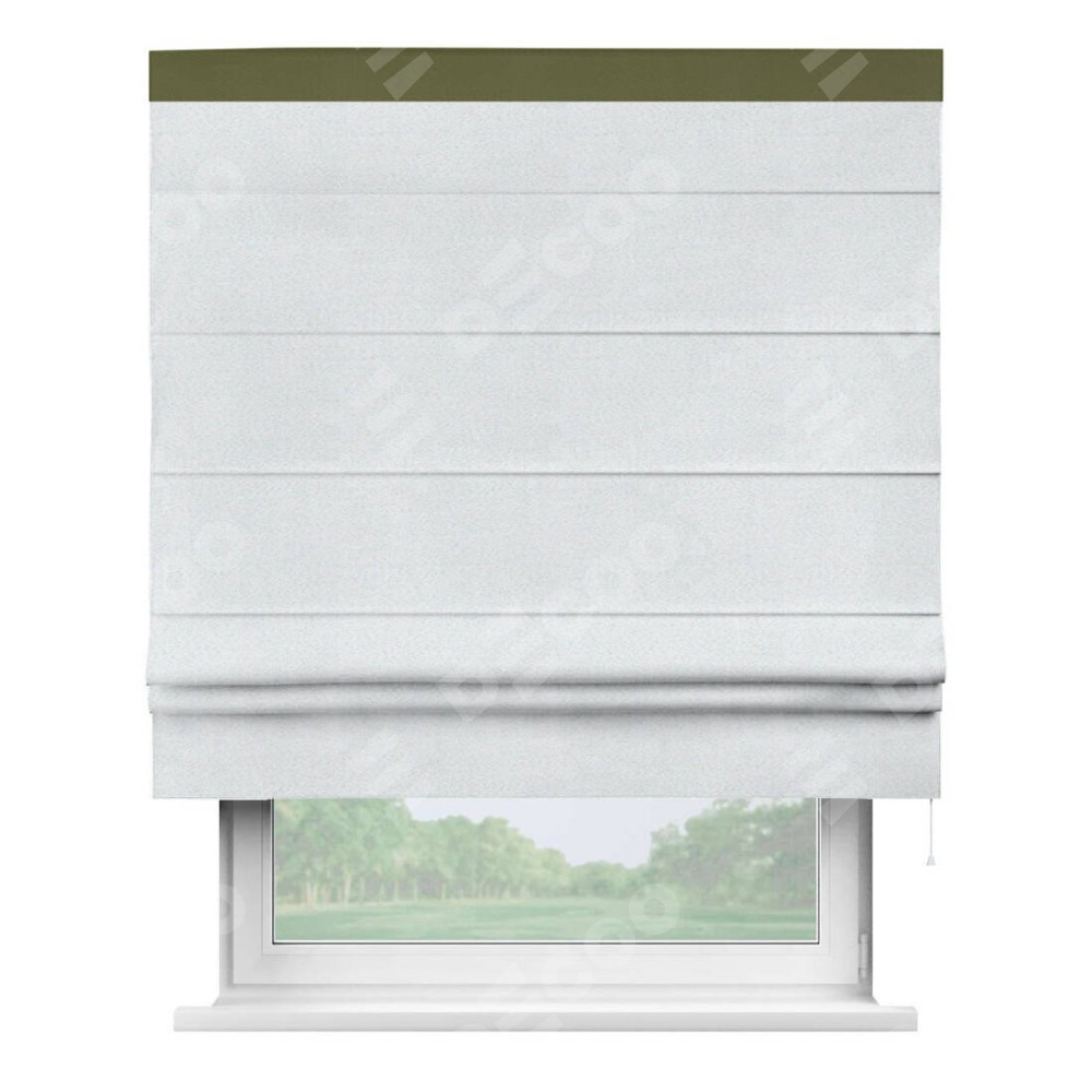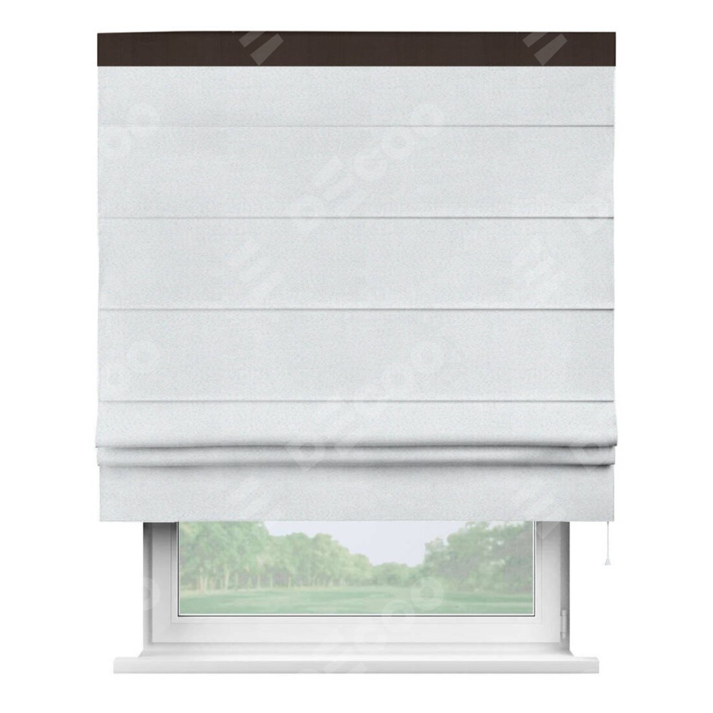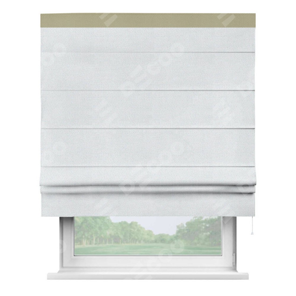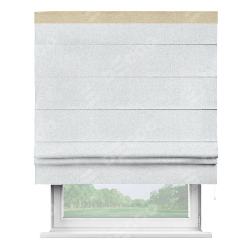 Римская штора производителя «Cortin», используется для проёма, пошита из ткани блэкаут однотонный дымчато-белый, артикул ткани 101. Отделка шторы кантом «Кинг», ткань для канта используется из блэкаута однотонного разной расцветки на выбор. Имеет универсальный механизм и подходит для монтажа: на потолок, на стену и в нишу.