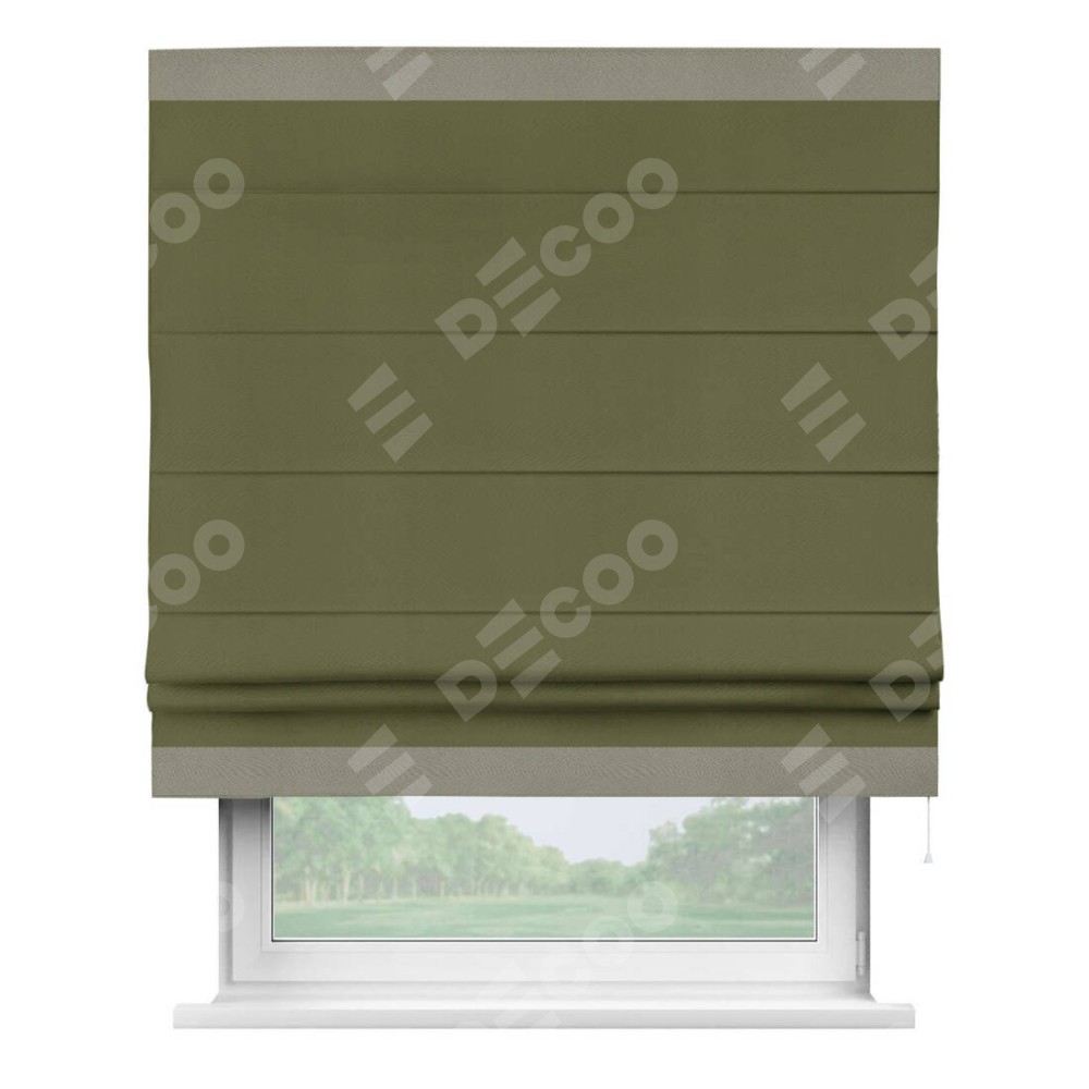 Римская штора производителя «Cortin», используется для проёма, пошита из ткани блэкаут однотонный зелёный, артикул ткани 81859. Отделка шторы кантом «Горизонт», ткань для канта используется из блэкаута однотонного разной расцветки на выбор. Имеет универсальный механизм и подходит для монтажа: на потолок, на стену и в нишу.