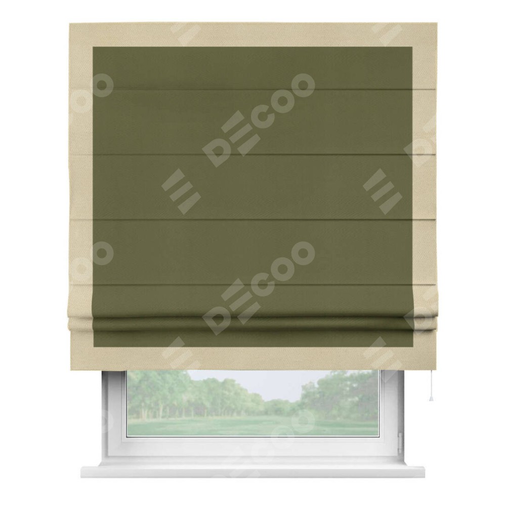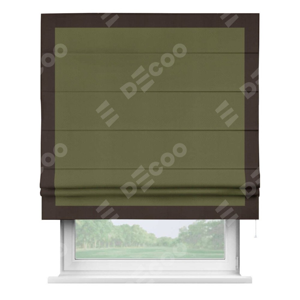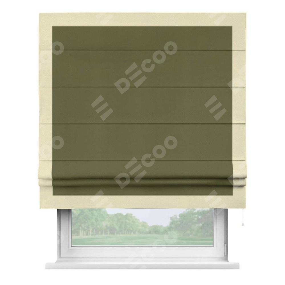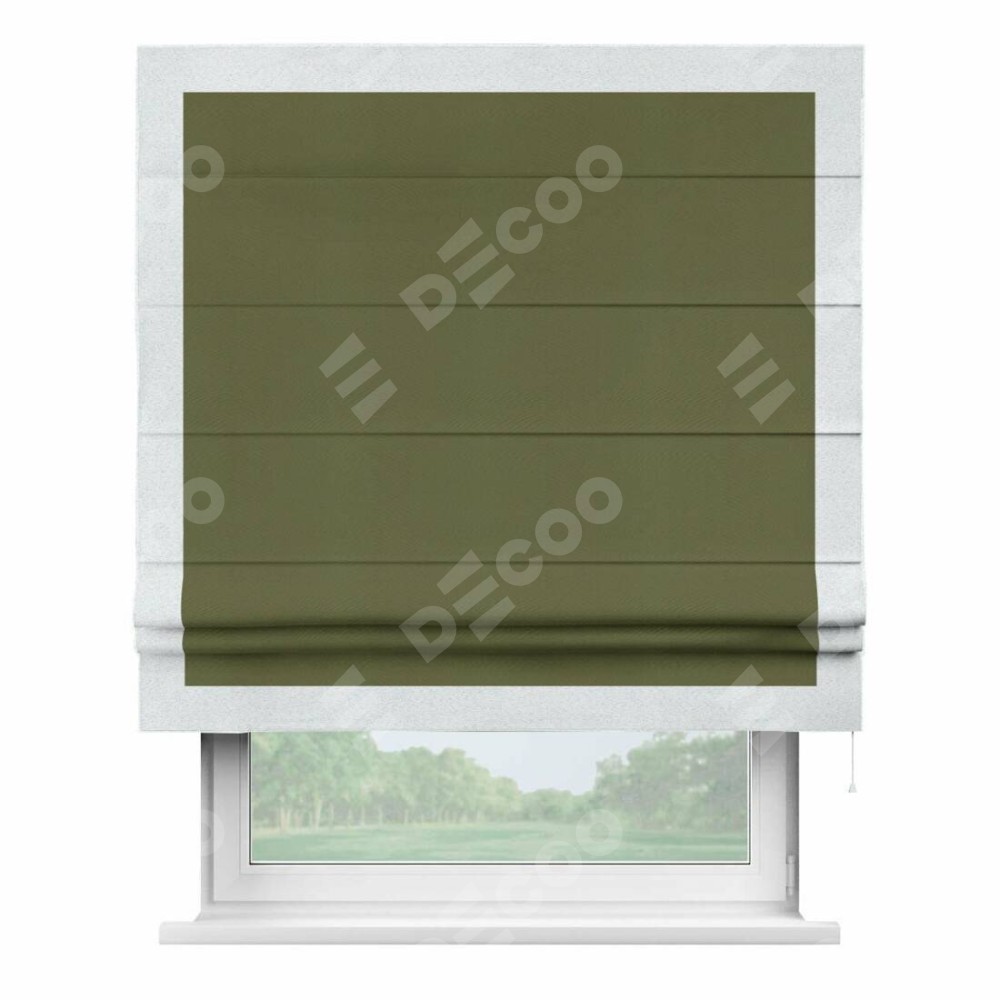 Римская штора производителя «Cortin», используется для проёма, пошита из ткани блэкаут однотонный зелёный, артикул ткани 81859. Отделка шторы кантом «Чесс», ткань для канта используется из блэкаута однотонного разной расцветки на выбор. Имеет универсальный механизм и подходит для монтажа: на потолок, на стену и в нишу.