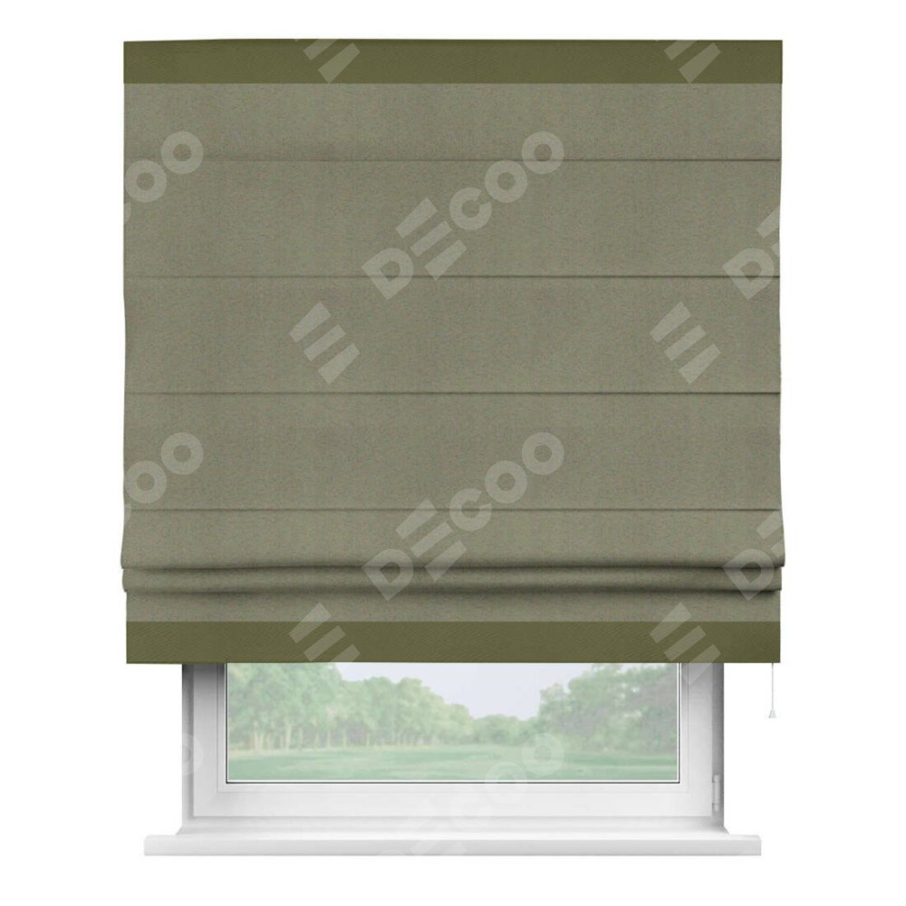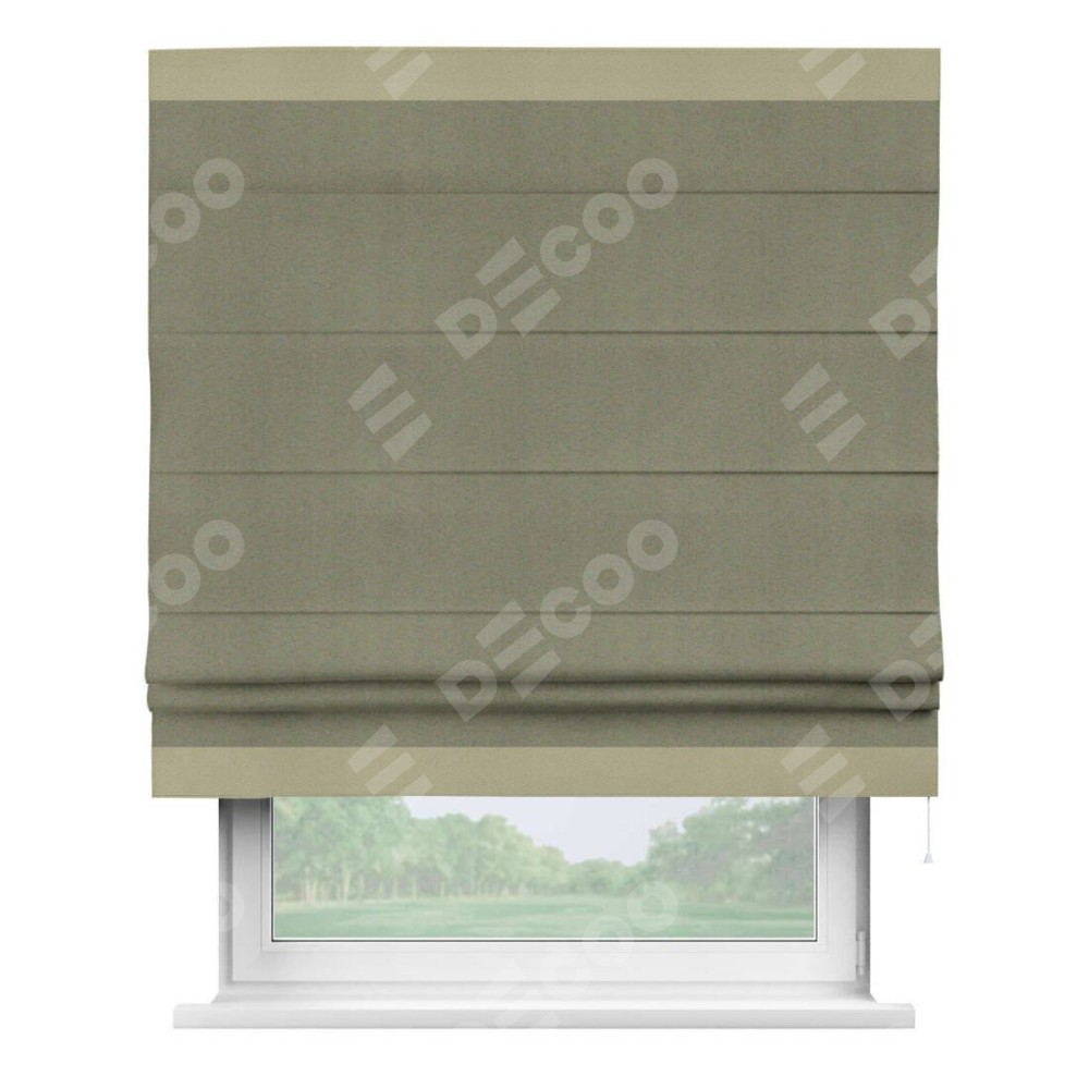 Римская штора производителя «Cortin», используется для проёма, пошита из ткани блэкаут однотонный серо-коричневый, артикул ткани 29568. Отделка шторы кантом «Горизонт», ткань для канта используется из блэкаута однотонного разной расцветки на выбор. Имеет универсальный механизм и подходит для монтажа: на потолок, на стену и в нишу.