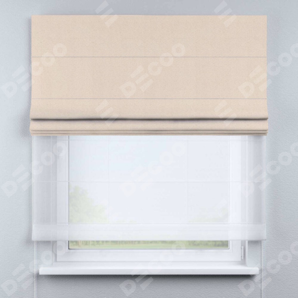 Римская штора день-ночь производителя «Cortin», используется для проёма, пошита из двух полотен, с лицевой стороны блэкаут тиснение с блеском розовая пудра артикул 34632, вторая ткань тюль (по стандарту комплектуется тюль белого цвета артикул V-01). Изнаночная сторона основного материала черного цвета, что обеспечивает необходимую светонепроницаемость. Имеет универсальный механизм и подходит для монтажа: на потолок, на стену и в нишу.