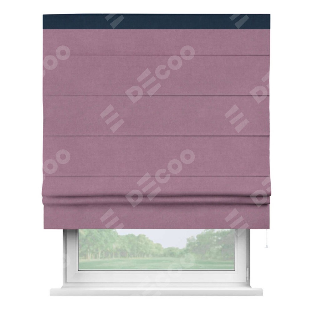 Римская штора производителя «Cortin», используется для проёма, пошита из ткани вельвет лиловый, артикул ткани 17752. Отделка шторы кантом «Кинг», ткань для канта используется из вельвета разной расцветки на выбор. Имеет универсальный механизм и подходит для монтажа: на потолок, на стену и в нишу.
