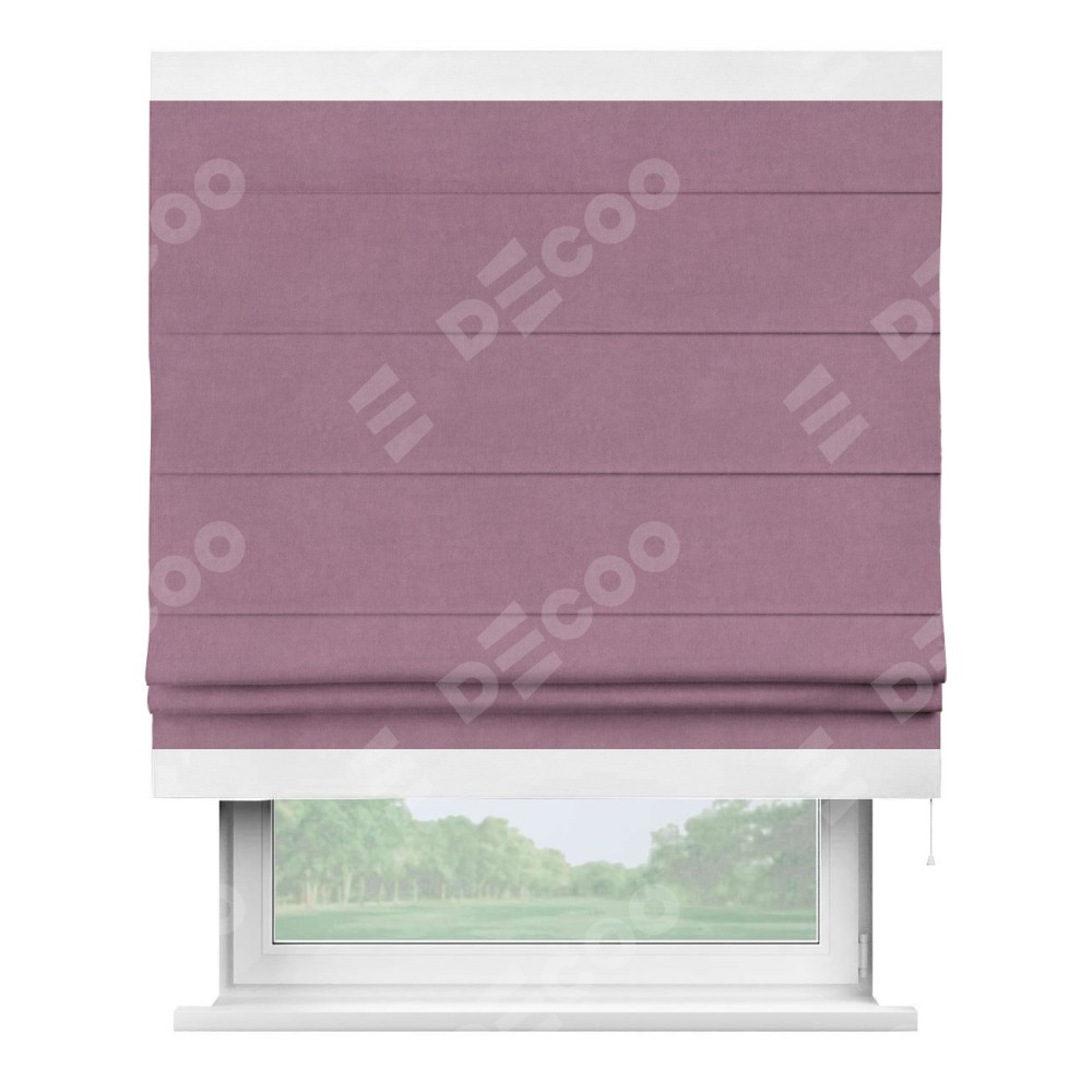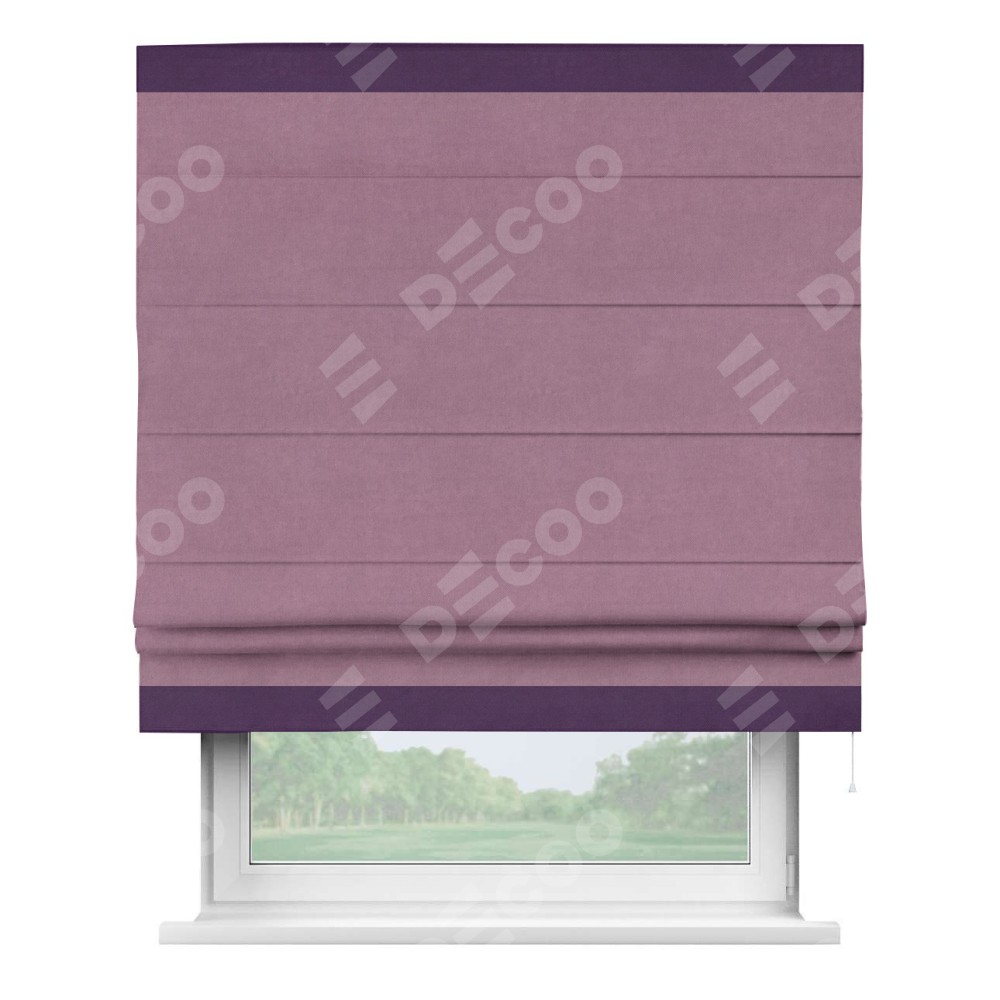 Римская штора производителя «Cortin», используется для проёма, пошита из ткани вельвет лиловый, артикул ткани 17752. Отделка шторы кантом «Горизонт», ткань для канта используется из вельвета разной расцветки на выбор. Имеет универсальный механизм и подходит для монтажа: на потолок, на стену и в нишу.