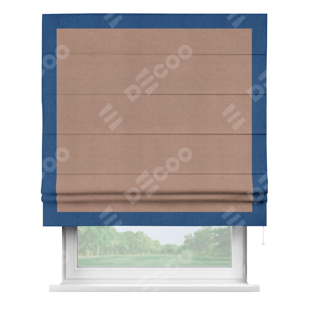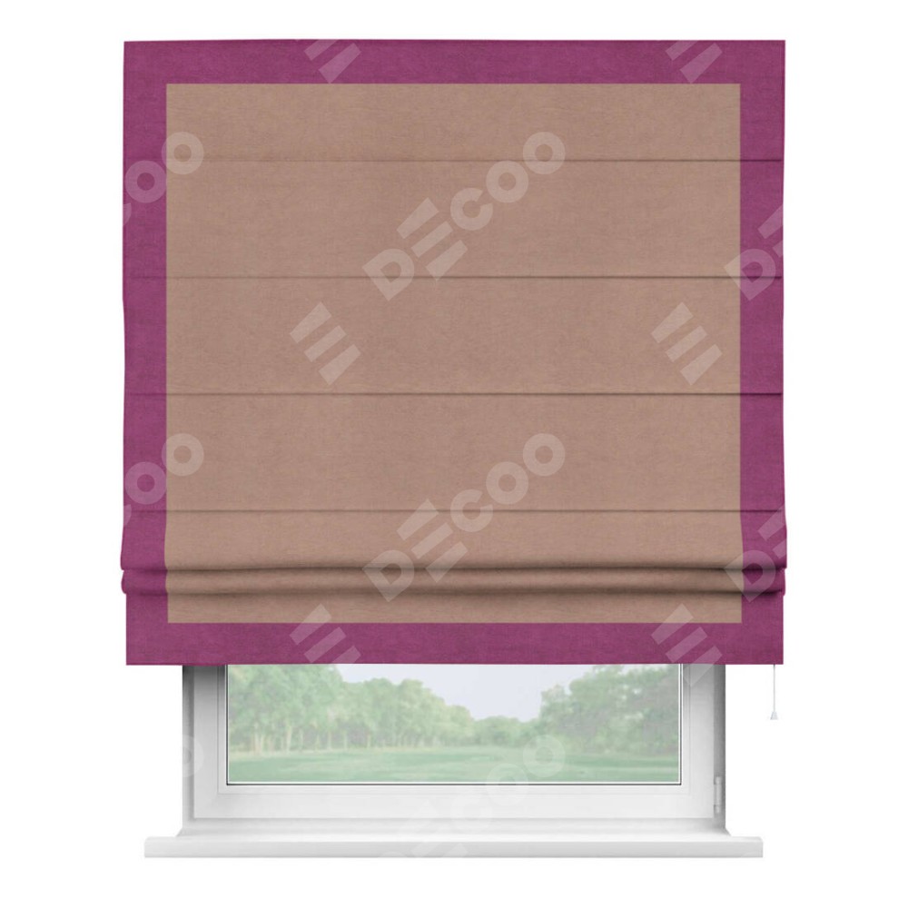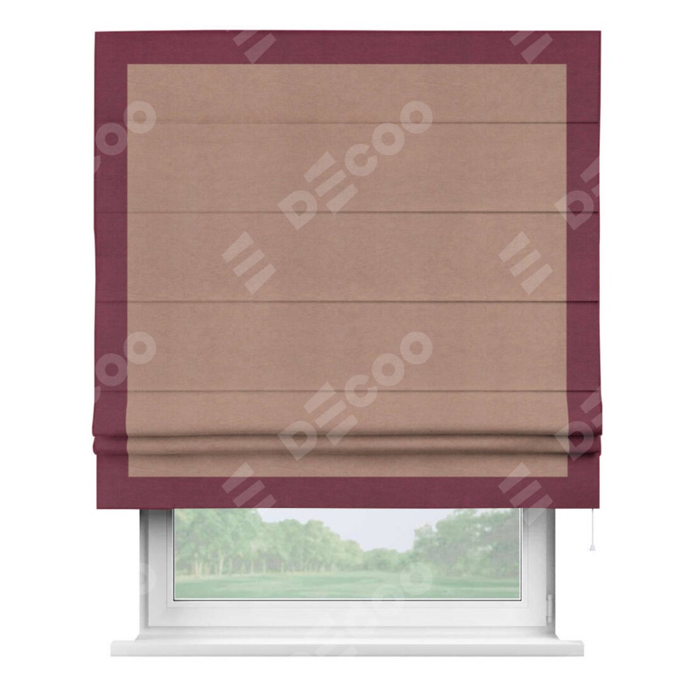 Римская штора производителя «Cortin», используется для проёма, пошита из ткани вельвет брусничный джем, артикул ткани 17750. Отделка шторы кантом «Чесс», ткань для канта используется из вельвета разной расцветки на выбор. Имеет универсальный механизм и подходит для монтажа: на потолок, на стену и в нишу.