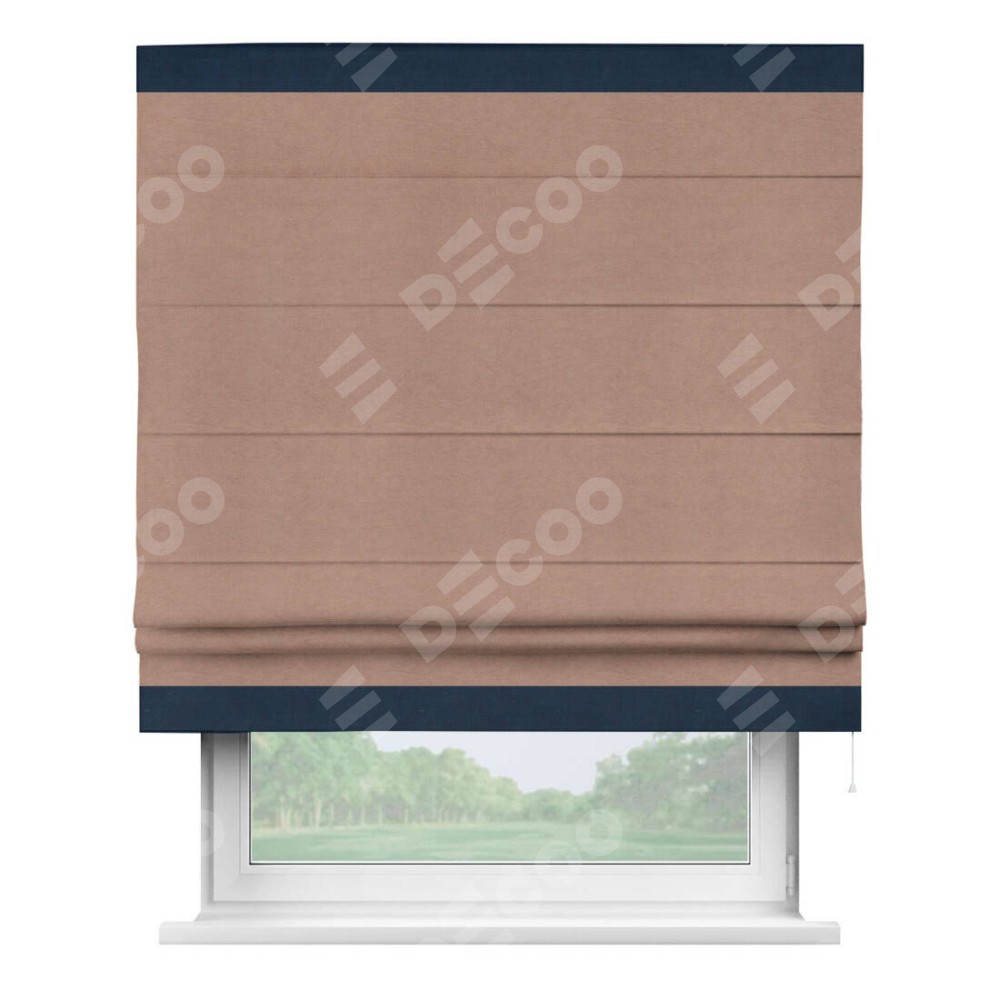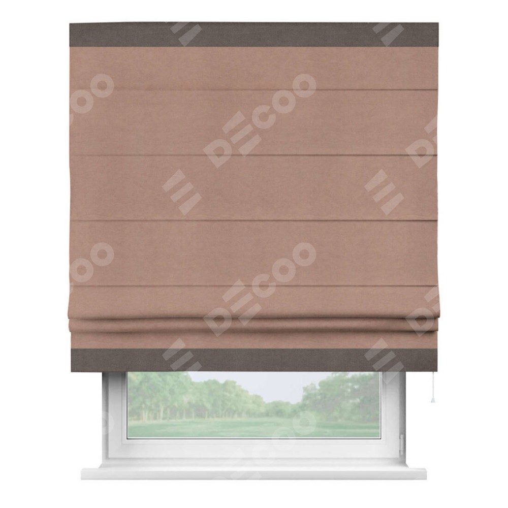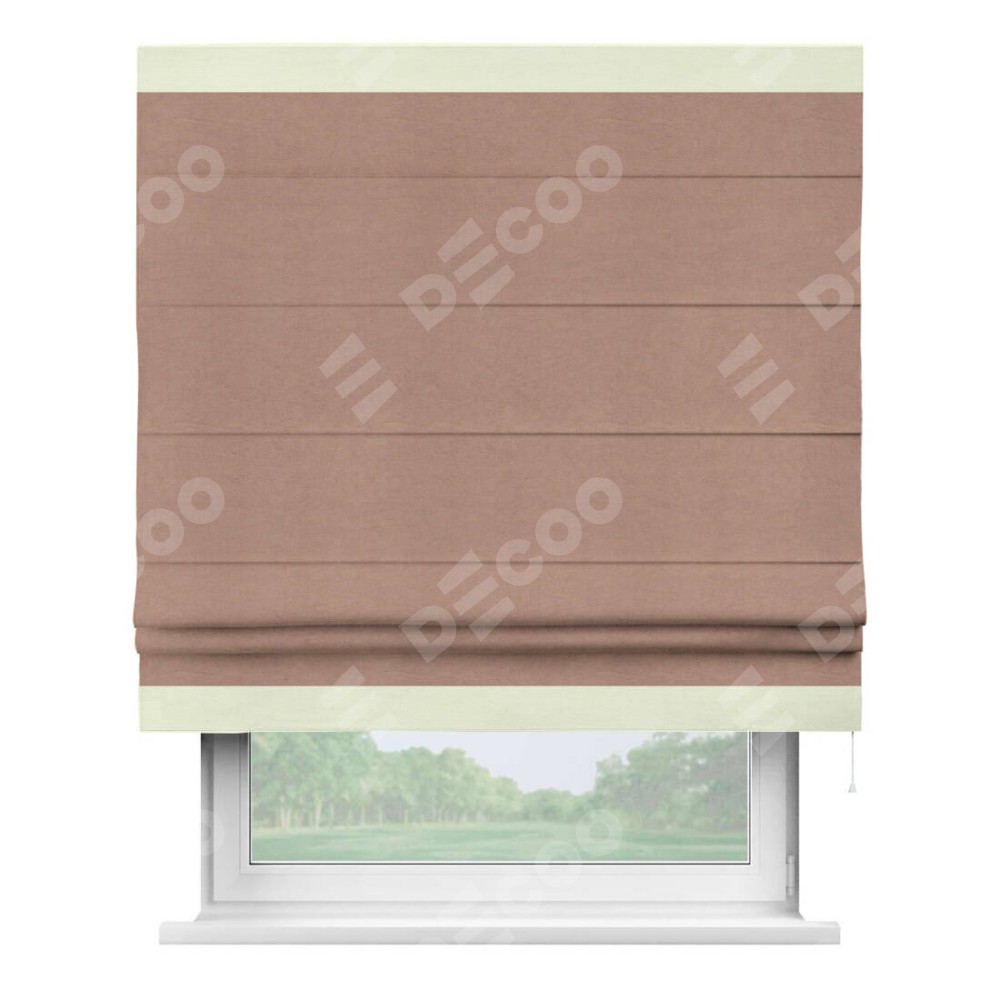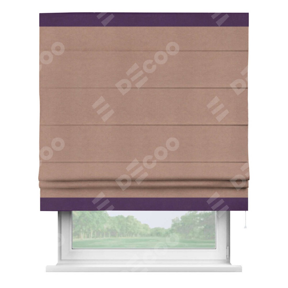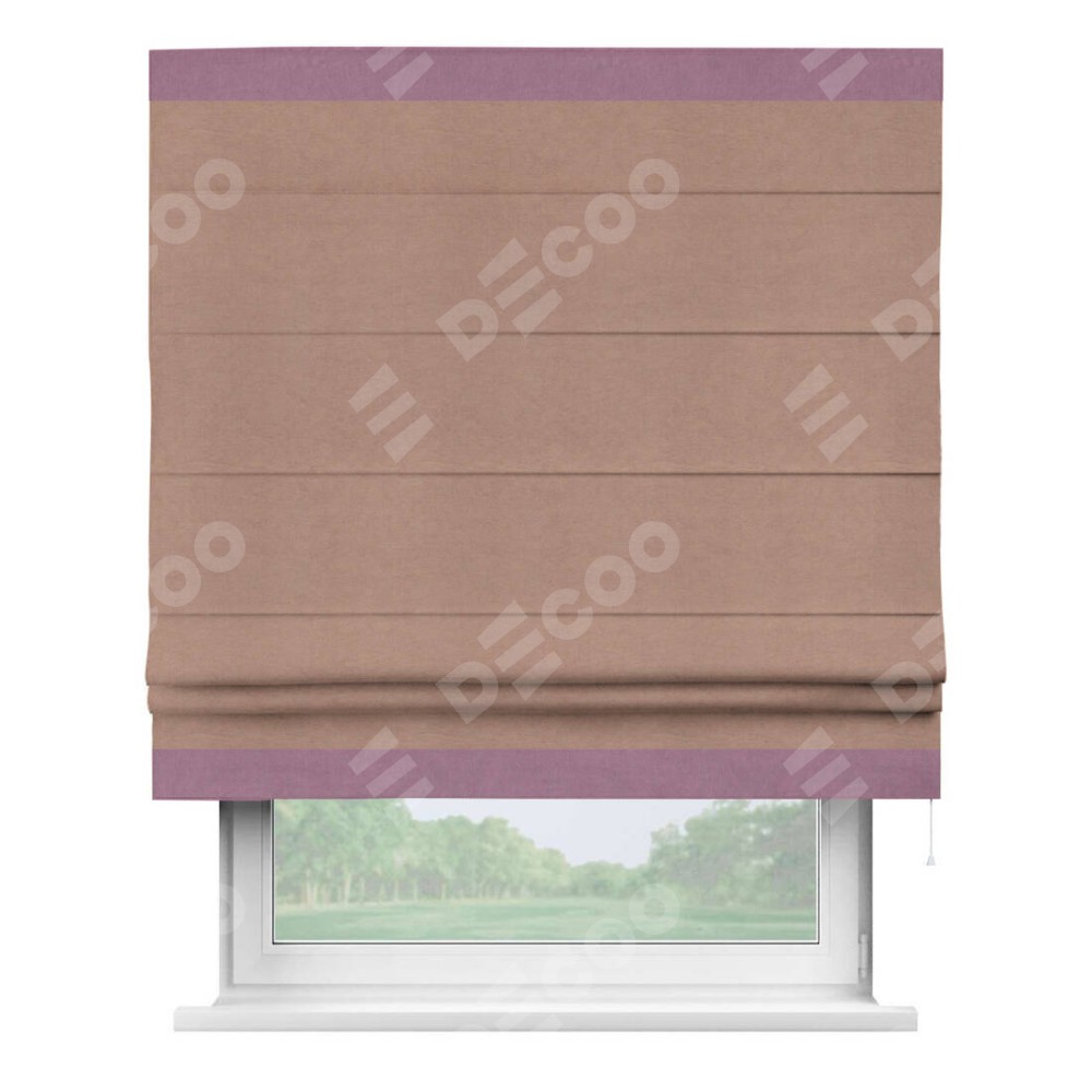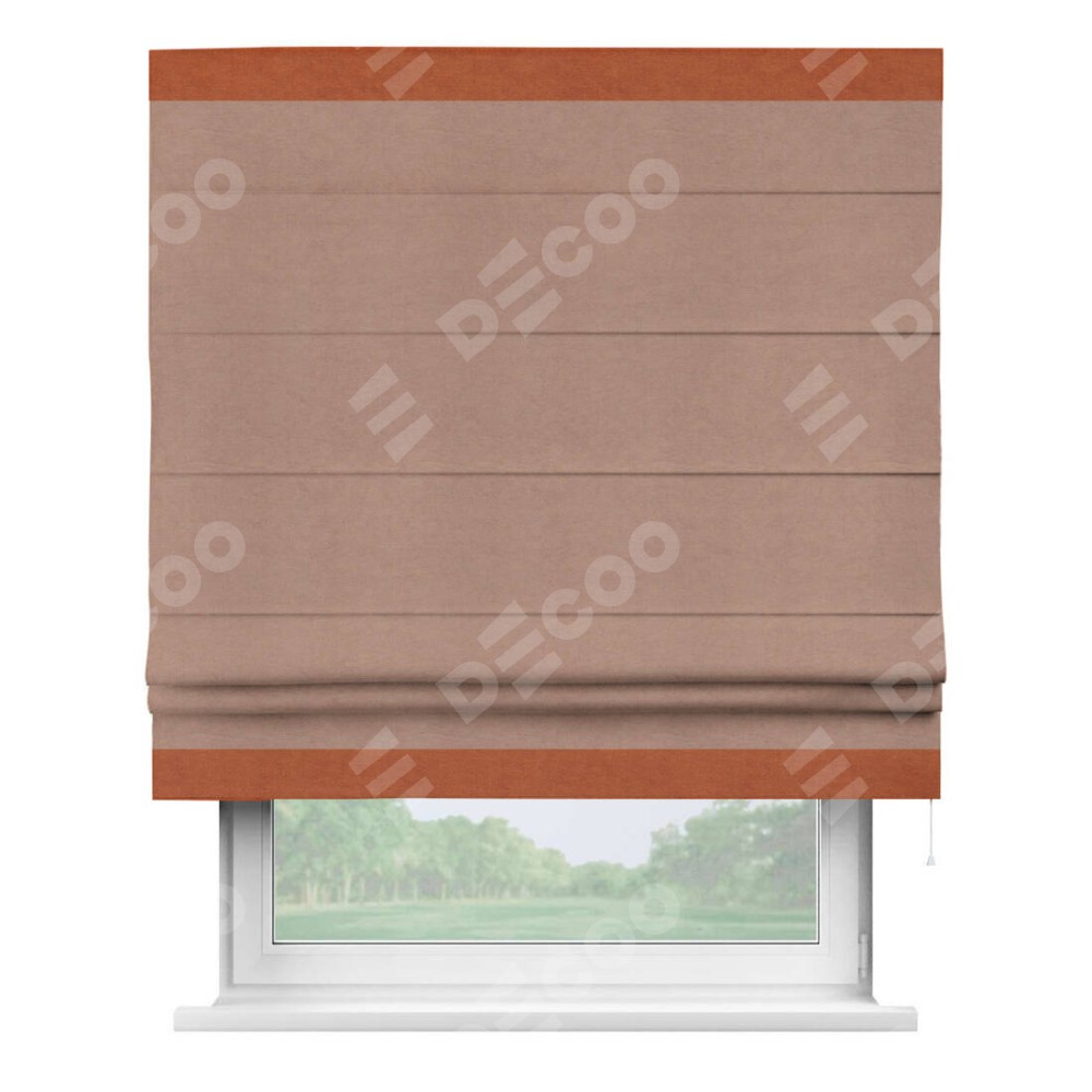 Римская штора производителя «Cortin», используется для проёма, пошита из ткани вельвет брусничный джем, артикул ткани 17750. Отделка шторы кантом «Горизонт», ткань для канта используется из вельвета разной расцветки на выбор. Имеет универсальный механизм и подходит для монтажа: на потолок, на стену и в нишу.