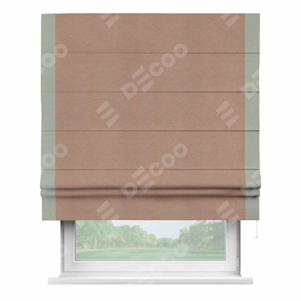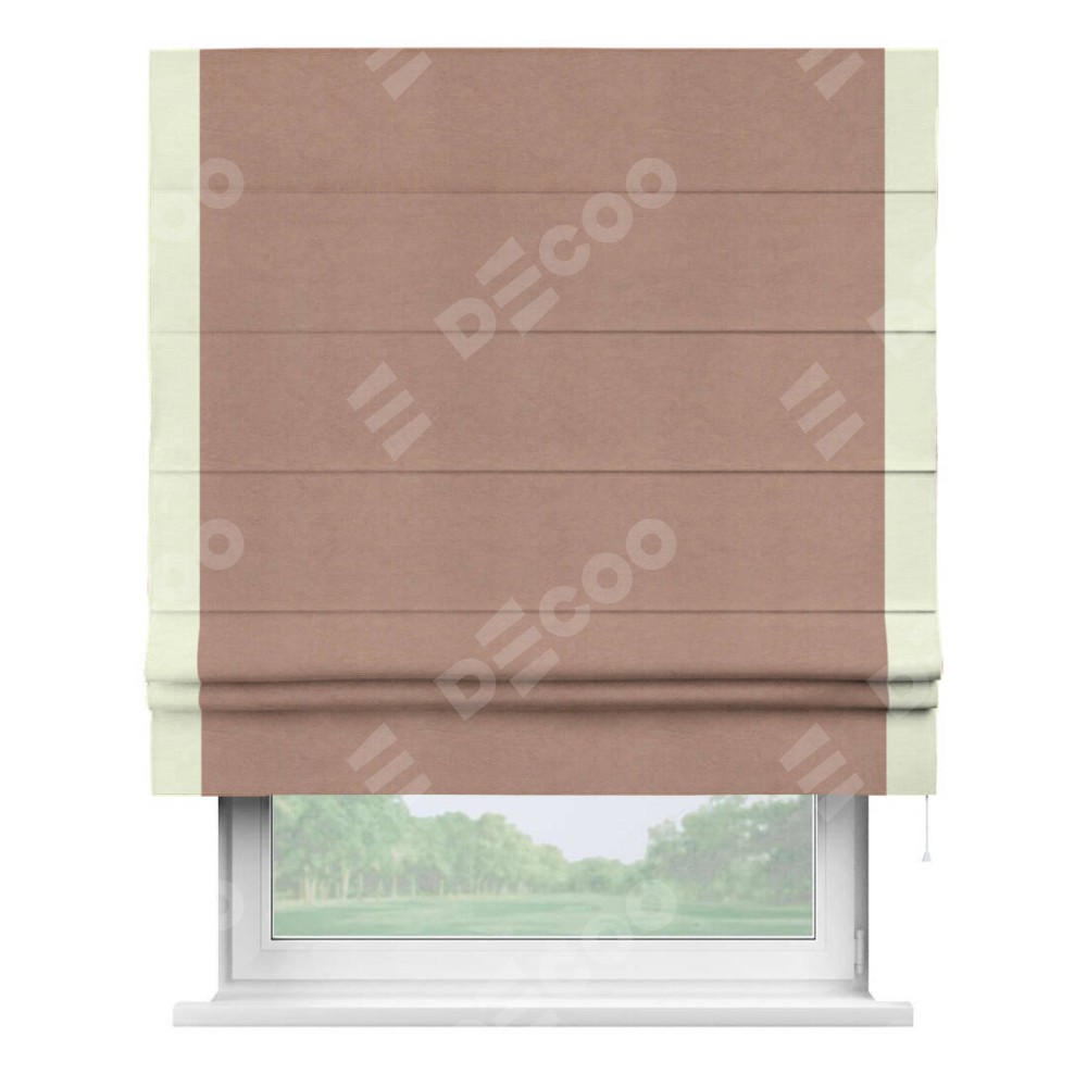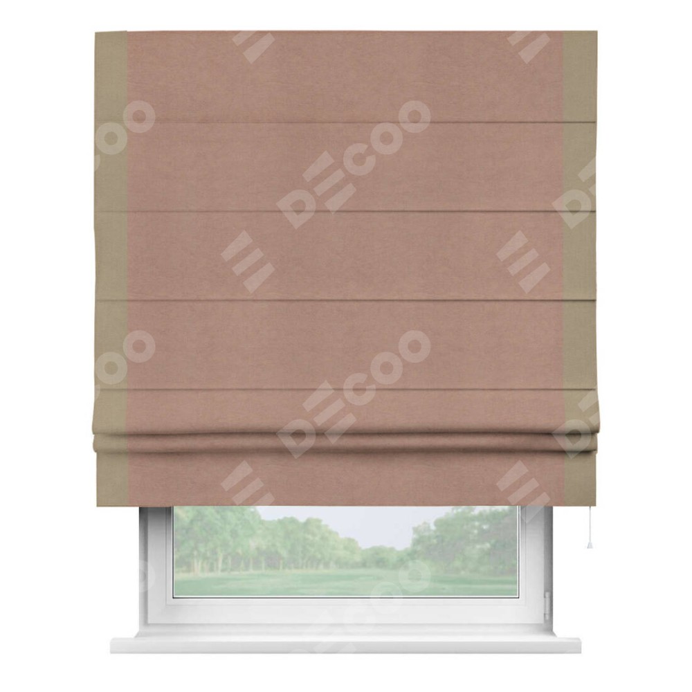 Римская штора производителя «Cortin», используется для проёма, пошита из ткани вельвет брусничный джем, артикул ткани 17750. Отделка шторы кантом «Стрим Дуо», ткань для канта используется из вельвета разной расцветки на выбор. Имеет универсальный механизм и подходит для монтажа: на потолок, на стену и в нишу.