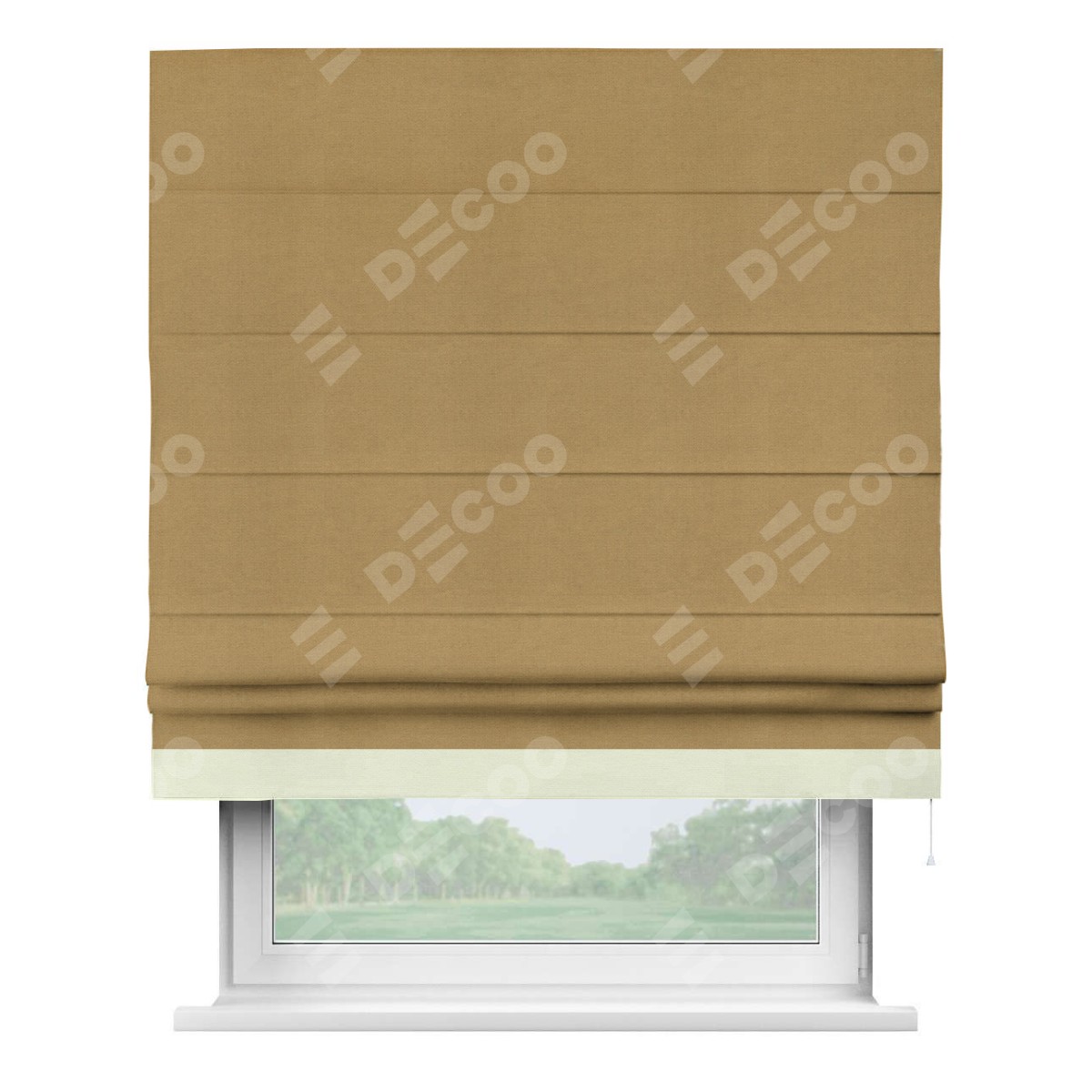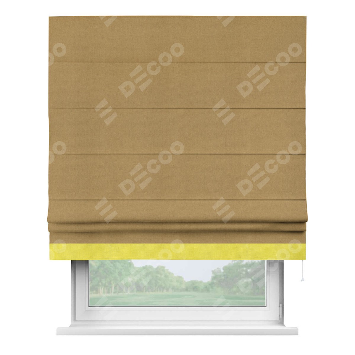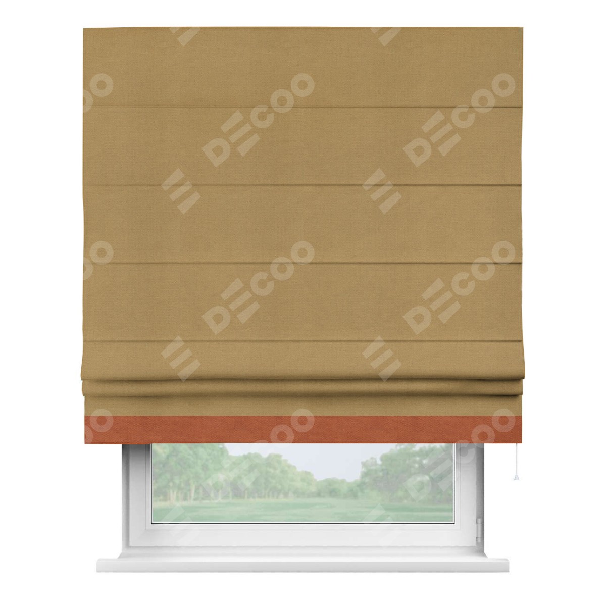 Римская штора производителя «Cortin», используется для проёма, пошита из ткани вельвет горчица, артикул ткани 17760. Отделка шторы кантом «Джестер», ткань для канта используется из вельвета разной расцветки на выбор. Имеет универсальный механизм и подходит для монтажа: на потолок, на стену и в нишу.