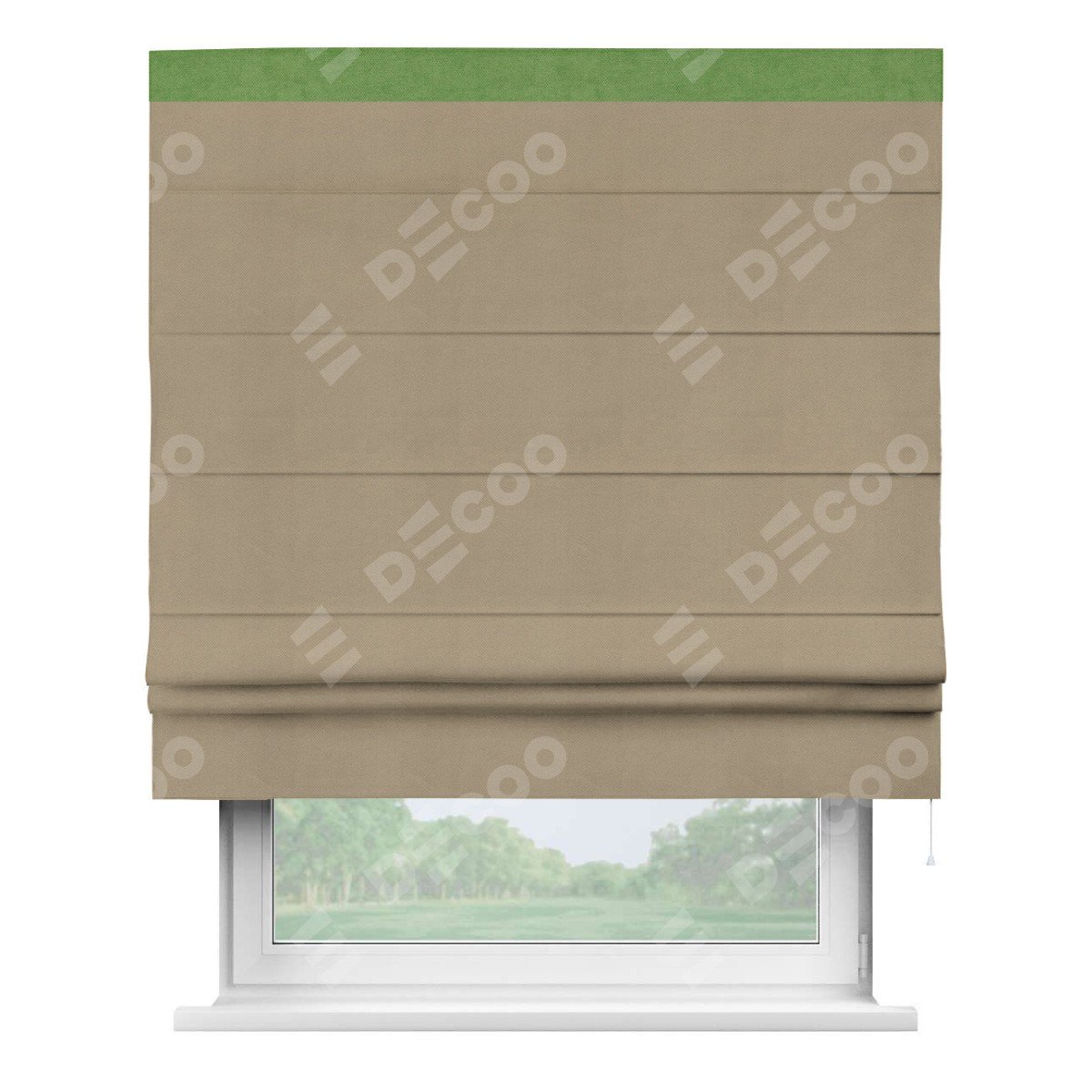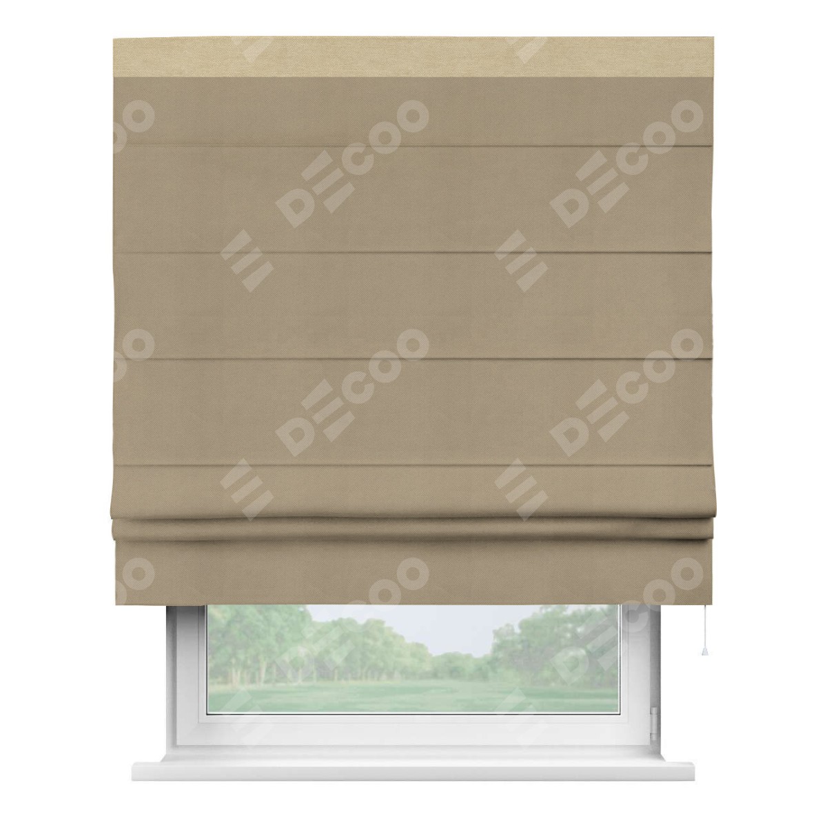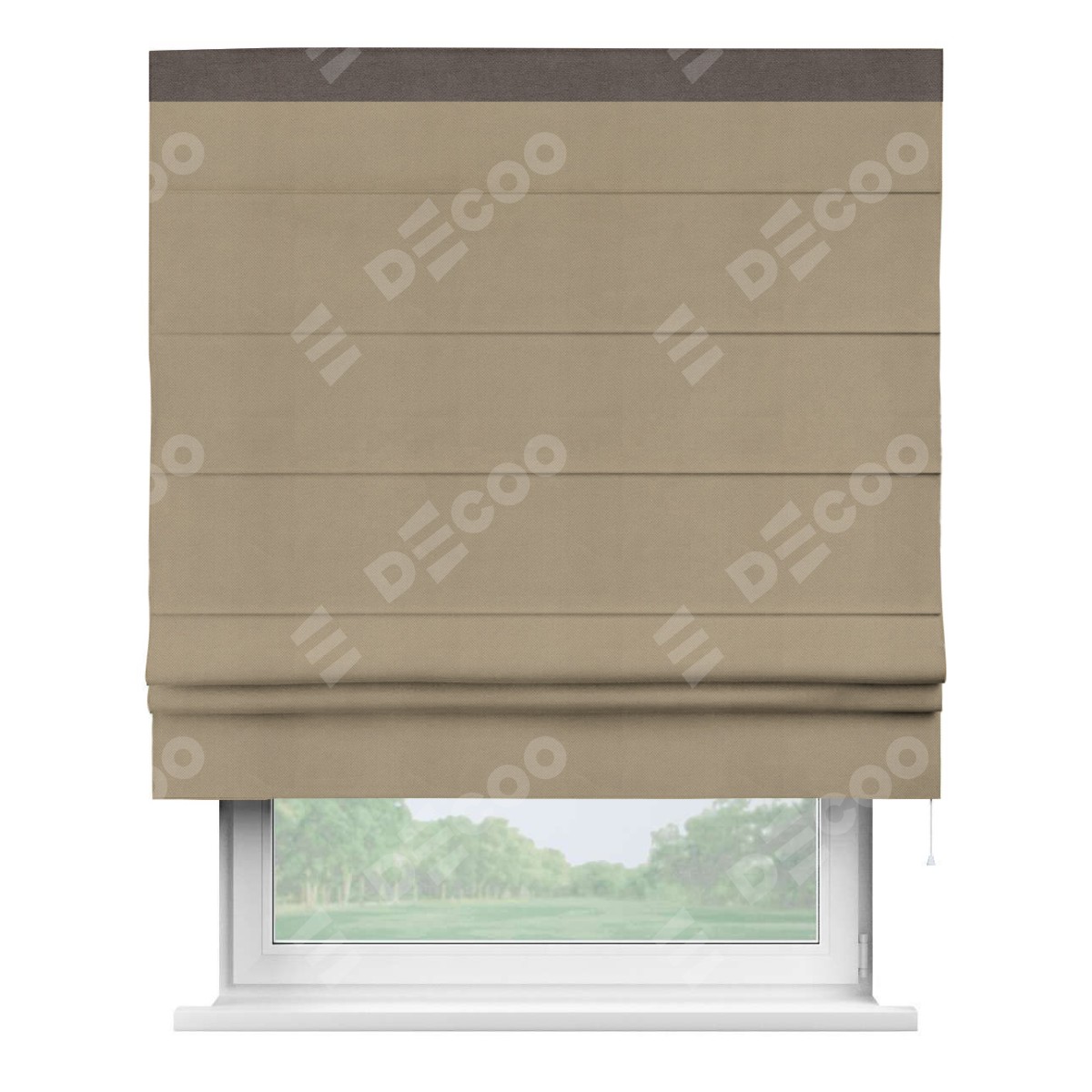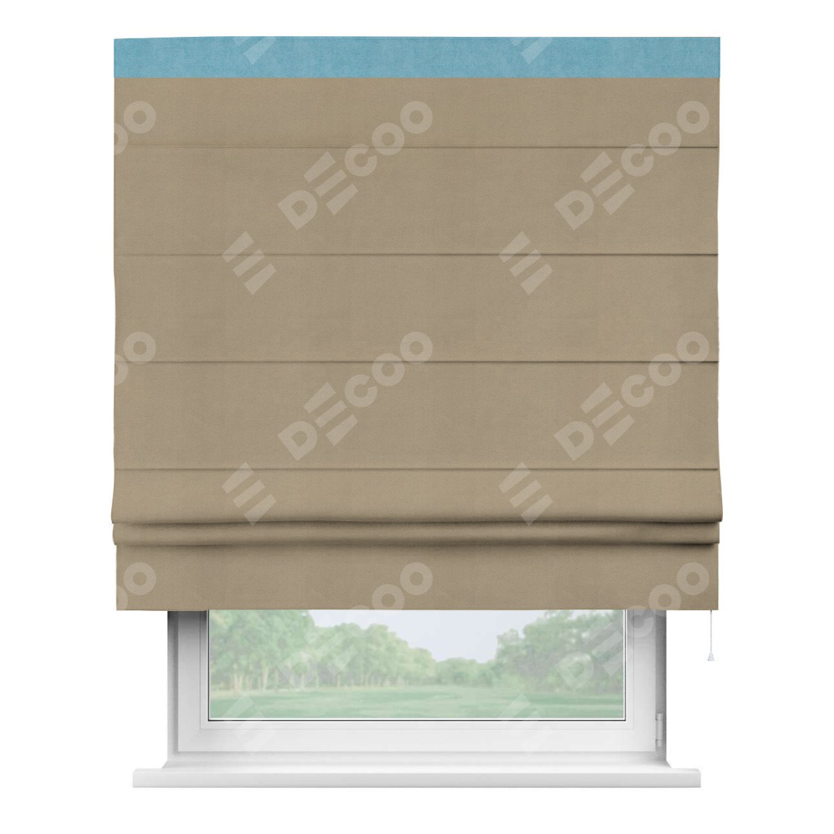 Римская штора производителя «Cortin», используется для проёма, пошита из ткани вельвет кофейный, артикул ткани 30980. Отделка шторы кантом «Кинг», ткань для канта используется из вельвета разной расцветки на выбор. Имеет универсальный механизм и подходит для монтажа: на потолок, на стену и в нишу.