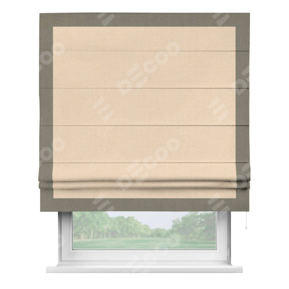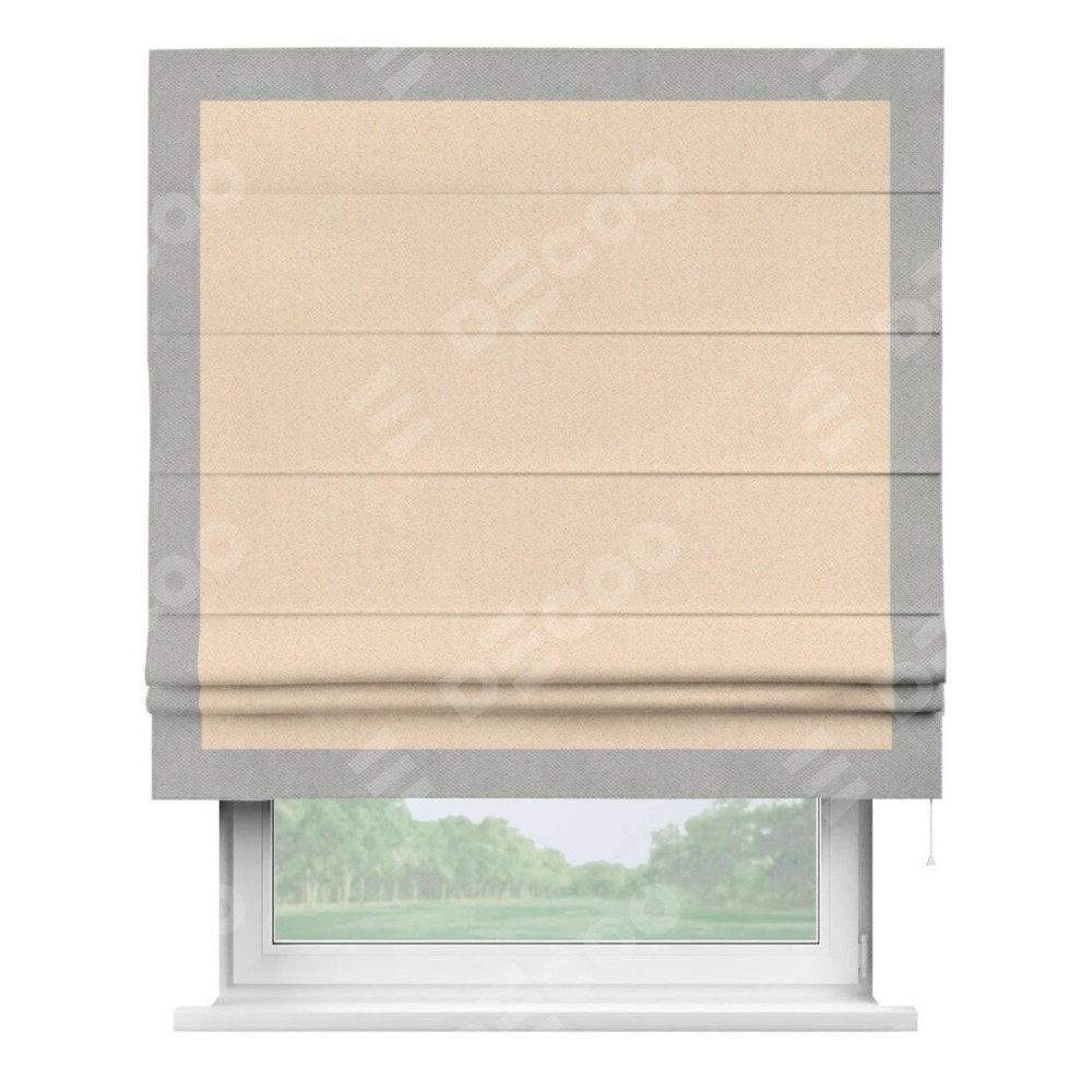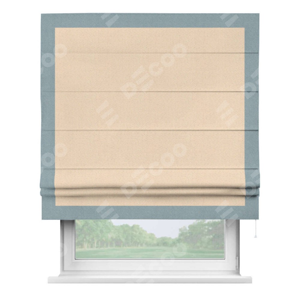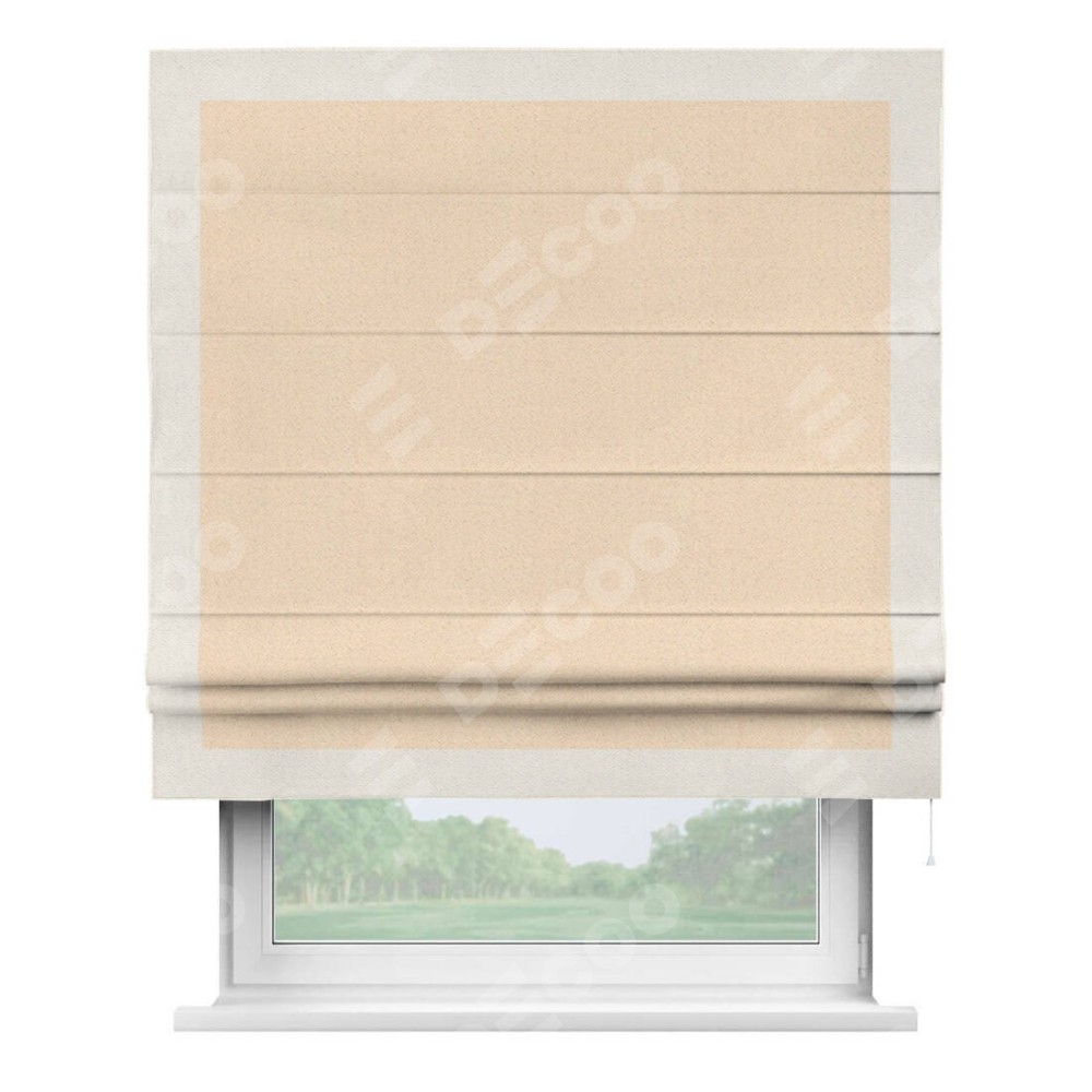 Римская штора производителя «Cortin», используется для проёма, пошита из ткани блэкаут с блеском бежевый, артикул 34627. Отделка шторы кантом «Чесс», ткань для канта используется из блэкаута с блеском разной расцветки на выбор. Изнаночная сторона материала черного цвета, что обеспечивает необходимую светонепроницаемость. Имеет универсальный механизм и подходит для монтажа: на потолок, на стену и в нишу.