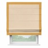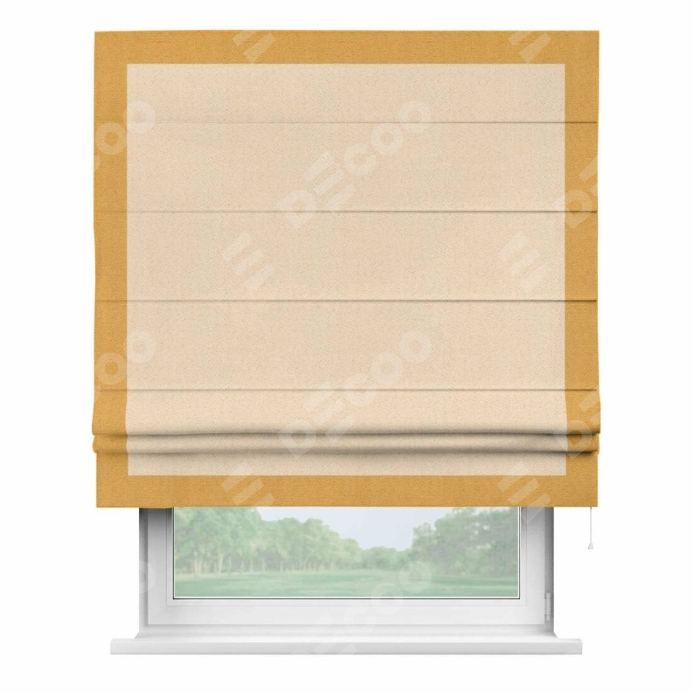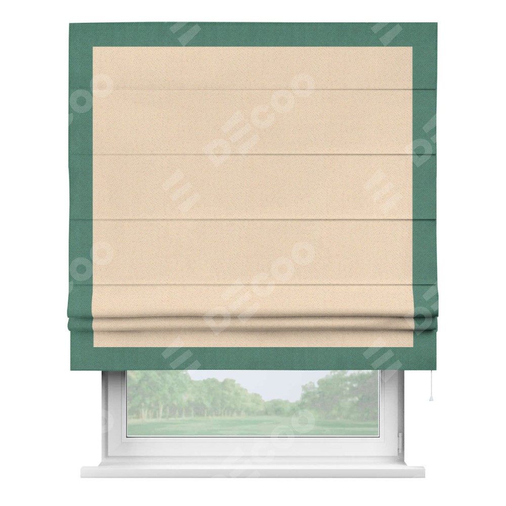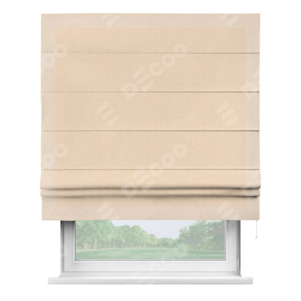 Римская штора производителя «Cortin», используется для проёма, пошита из ткани блэкаут с блеском бежевый, артикул 34627. Отделка шторы кантом «Чесс», ткань для канта используется из блэкаута с блеском разной расцветки на выбор. Изнаночная сторона материала черного цвета, что обеспечивает необходимую светонепроницаемость. Имеет универсальный механизм и подходит для монтажа: на потолок, на стену и в нишу.