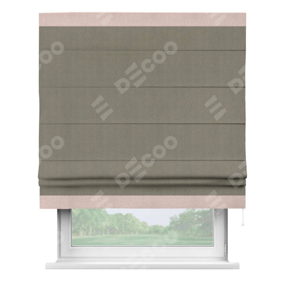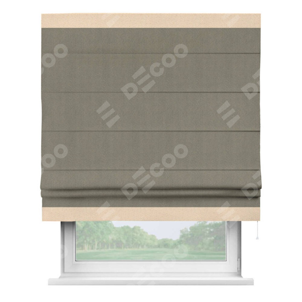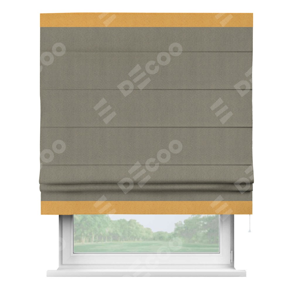 Римская штора производителя «Cortin», используется для проёма, пошита из ткани блэкаут с блеском графитовый, артикул 34648. Отделка шторы кантом «Горизонт», ткань для канта используется из блэкаута с блеском разной расцветки на выбор. Изнаночная сторона материала черного цвета, что обеспечивает необходимую светонепроницаемость. Имеет универсальный механизм и подходит для монтажа: на потолок, на стену и в нишу.