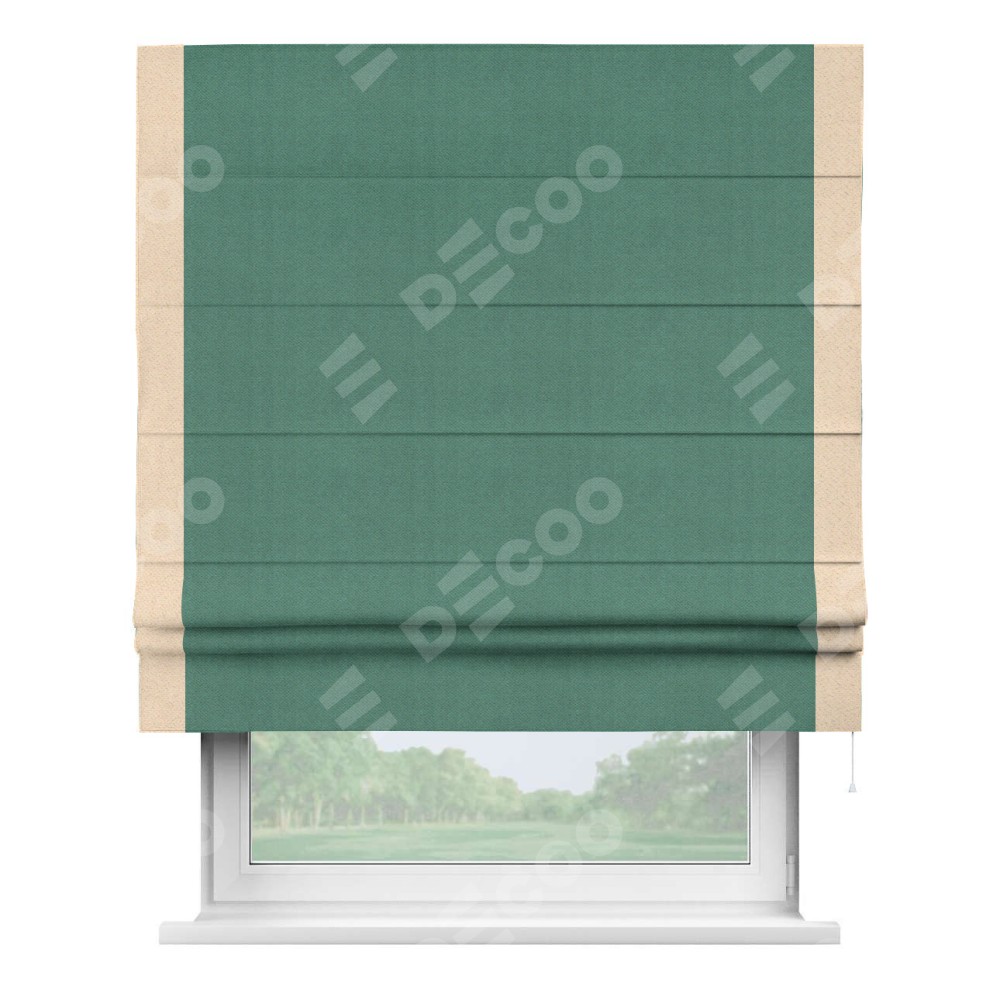Римская штора производителя «Cortin», используется для проёма, пошита из ткани блэкаут с блеском изумрудный, артикул 34628. Отделка шторы кантом «Стрим Дуо», ткань для канта используется из блэкаута с блеском разной расцветки на выбор. Изнаночная сторона материала черного цвета, что обеспечивает необходимую светонепроницаемость. Имеет универсальный механизм и подходит для монтажа: на потолок, на стену и в нишу.