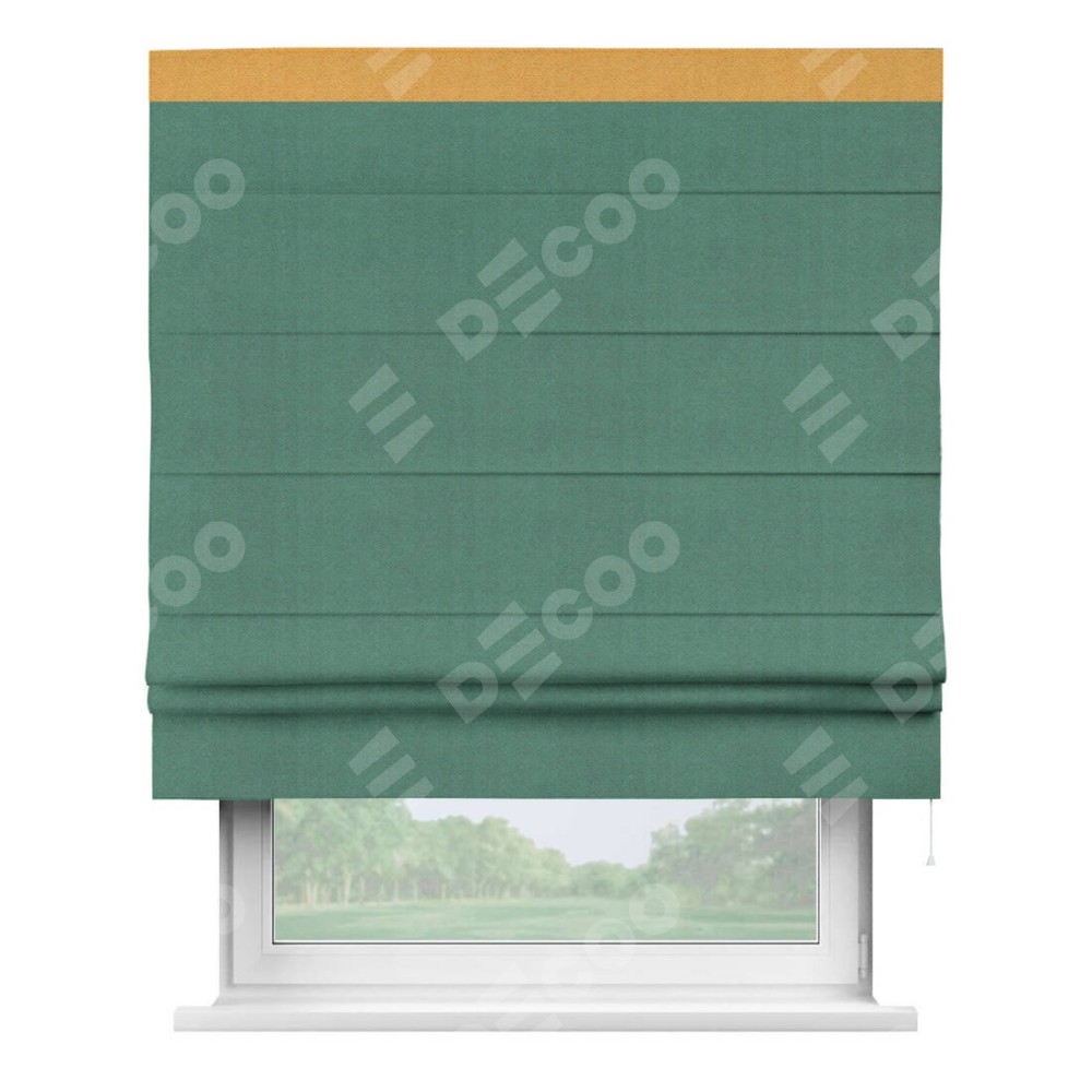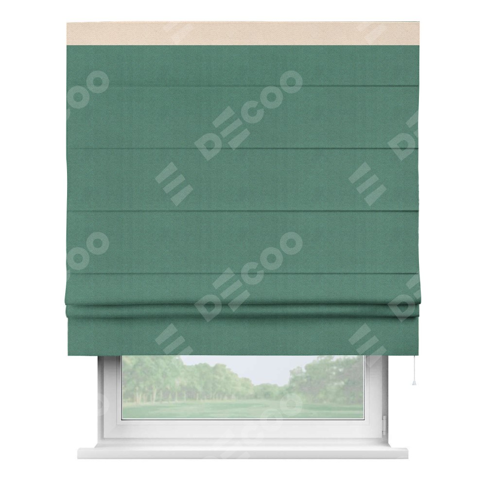Римская штора производителя «Cortin», используется для проёма, пошита из ткани блэкаут с блеском изумрудный, артикул 34628. Отделка шторы кантом «Кинг», ткань для канта используется из блэкаута с блеском разной расцветки на выбор. Изнаночная сторона материала черного цвета, что обеспечивает необходимую светонепроницаемость. Имеет универсальный механизм и подходит для монтажа: на потолок, на стену и в нишу.