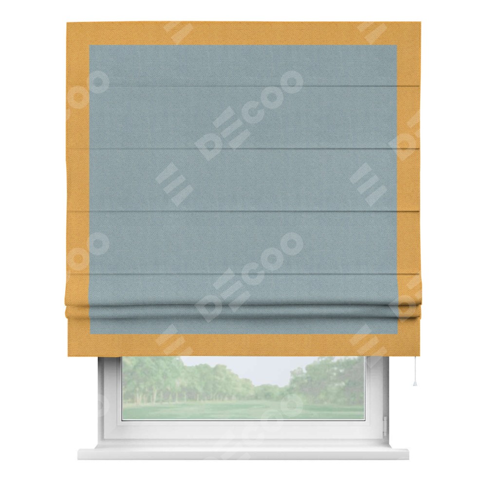 Римская штора производителя «Cortin», используется для проёма, пошита из ткани блэкаут с блеском синий, артикул 34625. Отделка шторы кантом «Чесс», ткань для канта используется из блэкаута с блеском разной расцветки на выбор. Изнаночная сторона материала черного цвета, что обеспечивает необходимую светонепроницаемость. Имеет универсальный механизм и подходит для монтажа: на потолок, на стену и в нишу.