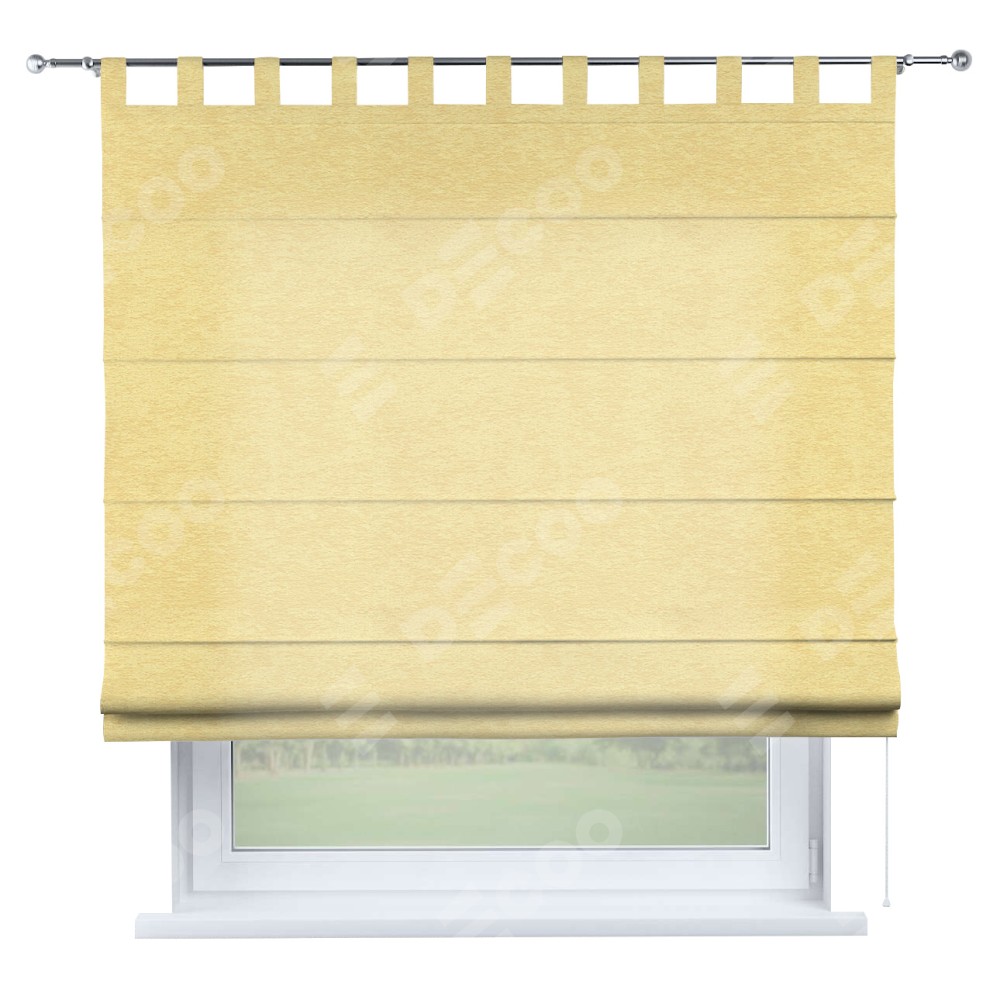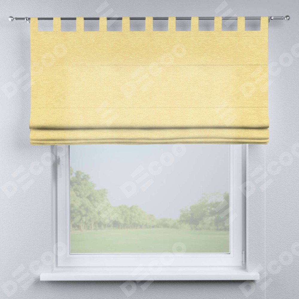 Римская штора производителя «Cortin», используется для проёма, пошита из ткани софт однотонный золотой, артикул ткани 42934. Данная модель пошита на петлях, комплектуется на выбор круглым карнизом и подходит для монтажа на стену. Римская штора на петлях имеет простую систему регулировки высоты, отличительным преимуществом данной модели является простой способ монтажа. Достаточно повесить ее на трубу и штора готова!